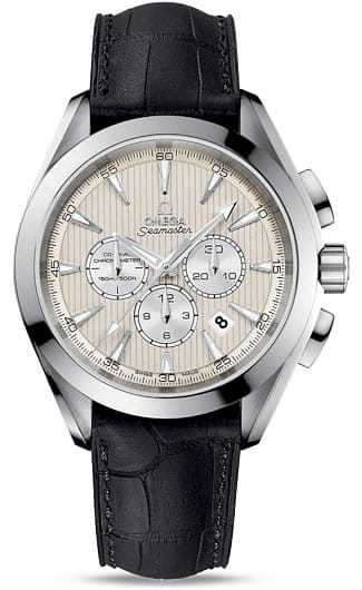 This classic yet robust timepiece represents a tribute to OMEGA's rich maritime heritage. The dramatic and easily-recognisable dial design of the OMEGA Seamaster Aqua Terra 150M collection recalls the wooden decks of luxury sailboats. This model features an ivory dial decorated with the Teak Concept pattern and a date window. Thirty-minute and 12-hour recorders, and a small seconds dial can be found at the 3, 6 and 9 o'clock positions, respectively. A scratch-resistant sapphire crystal protects this unique dial. The bezel is mounted on a 44 mm stainless steel case on a black leather strap. This certified chronometer is powered by the Co-Axial calibre 3313 which can be seen through the transparent caseback.