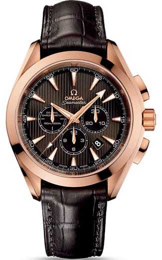 This classic yet robust timepiece represents a tribute to OMEGA's rich maritime heritage. The dramatic and easily-recognisable dial design of the OMEGA Seamaster Aqua Terra 150M collection recalls the wooden decks of luxury sailboats. This model features a grey dial decorated with the Teak Concept pattern and a date window. Thirty-minute and 12-hour recorders, and a small seconds dial can be found at the 3, 6 and 9 o'clock positions, respectively. A scratch-resistant sapphire crystal protects this unique dial. The bezel is mounted on a 44 mm 18K red gold case on a brown leather strap. This certified chronometer is powered by the Co-Axial calibre 3313 which can be seen through the transparent caseback.