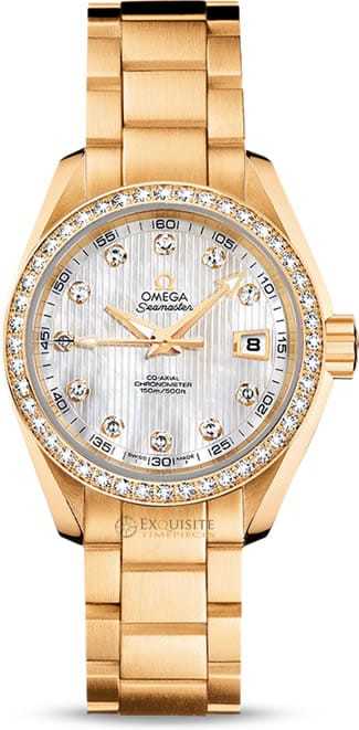 The diamond-set bezel is mounted on a 30 mm 18K yellow gold case on an 18K yellow gold bracelet. This timepiece is powered by the OMEGA Co-Axial calibre 8521 which can be seen through the transparent caseback.