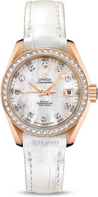 The diamond-set bezel is mounted on a 30 mm 18K red gold case on a white leather strap. This timepiece is powered by the OMEGA Co-Axial calibre 8521 which can be seen through the transparent caseback.