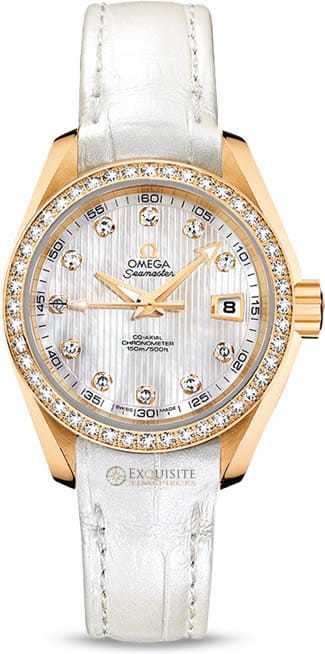 The diamond-set bezel is mounted on a 30 mm 18K yellow gold case on a white leather strap. This timepiece is powered by the OMEGA Co-Axial calibre 8521 which can be seen through the transparent caseback.