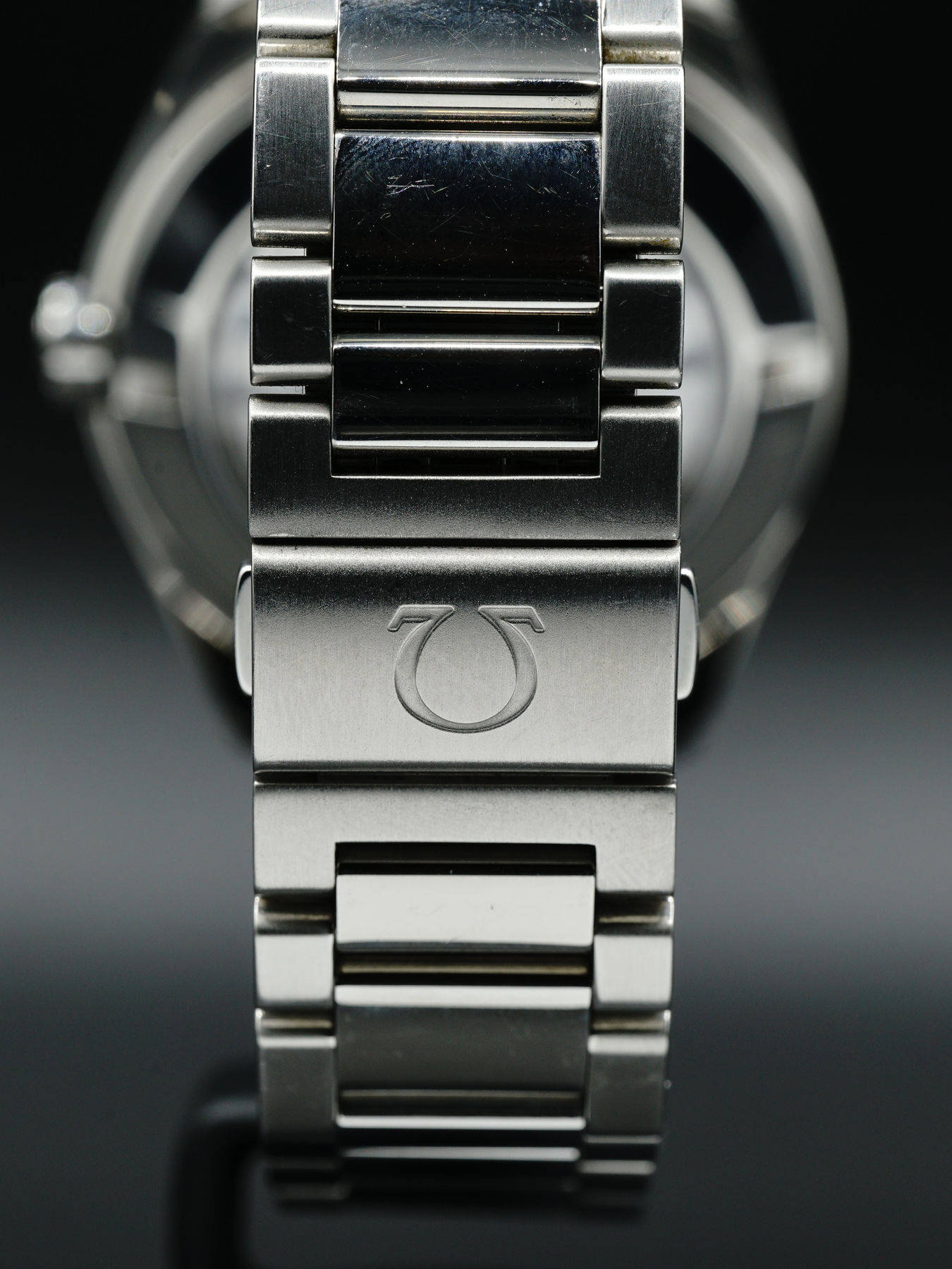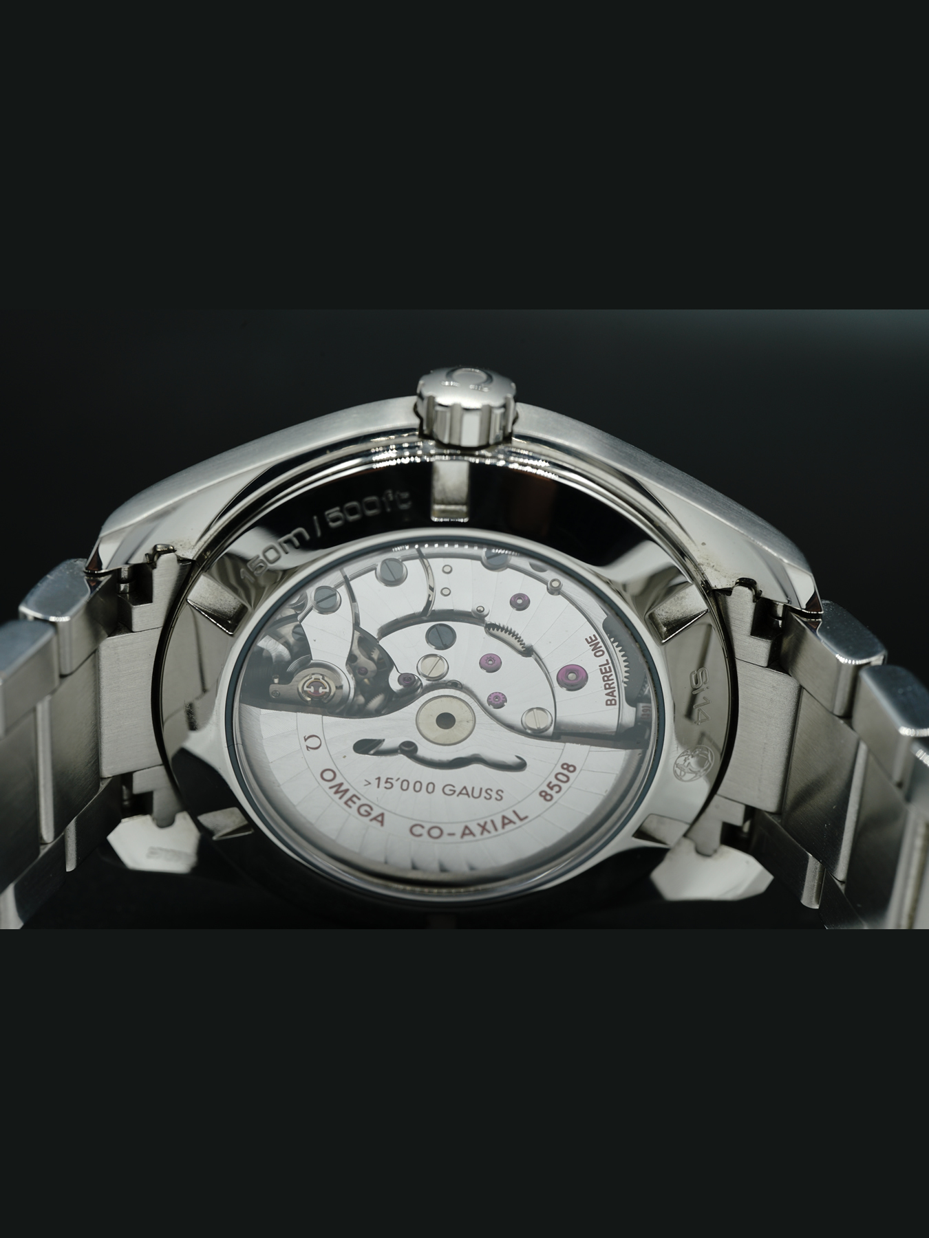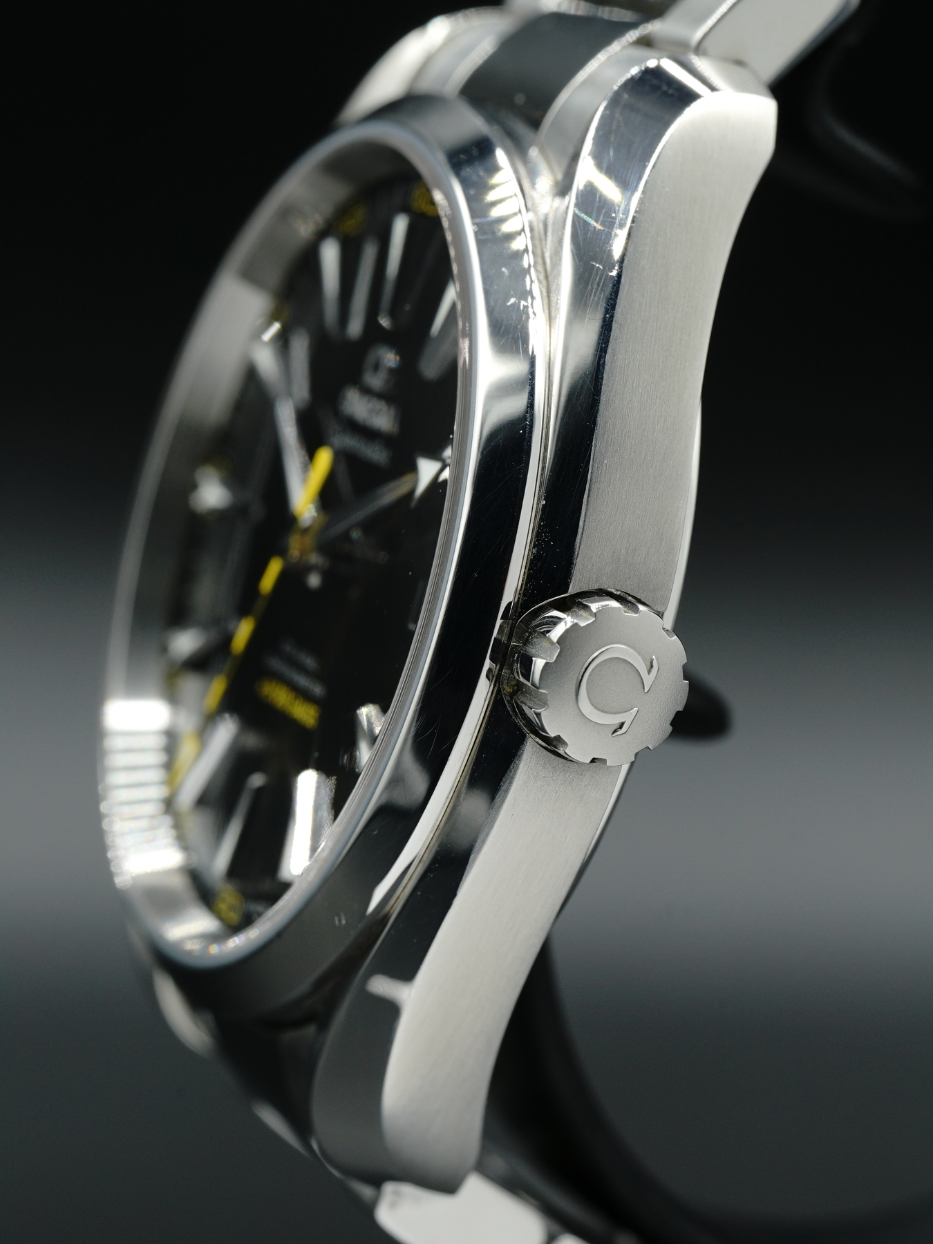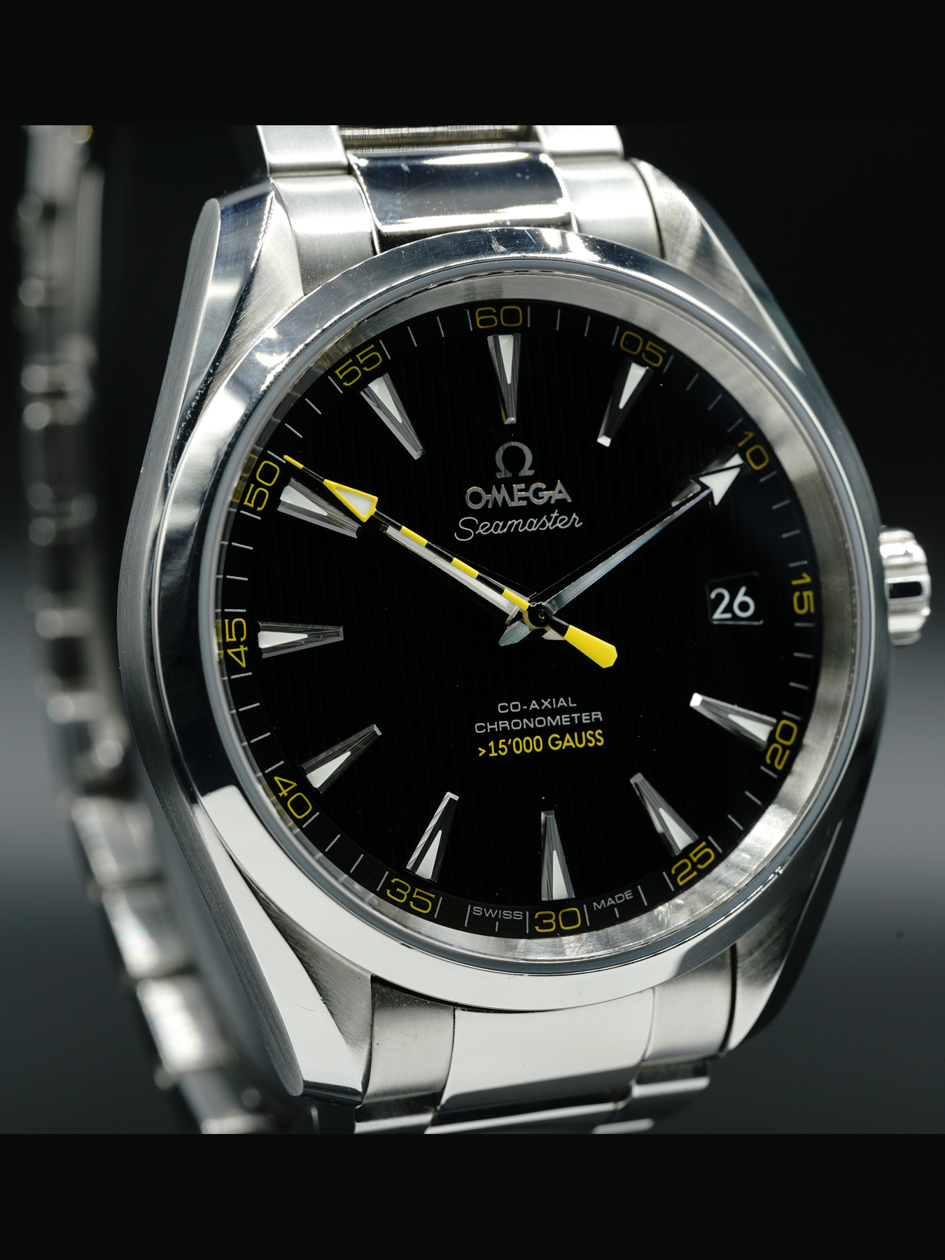 This Omega Seamaster Aqua Terra 150m is in GREAT condition. This watch includes its original inner box, and operating instructions.OMEGA's Seamaster Aqua Terra > 15,000 Gauss is the world's first completely anti-magnetic timepiece. This watch features a slightly yellow lacquered black dial with a date window at 3 o'clock and a black and yellow seconds hand which matches the yellow numerals on the minute track.The bezel is mounted on a 41.5 mm stainless steel case and is presented on a stainless steel bracelet. A scratch-resistant sapphire crystal protects this unique dial. A second scratch-resistant sapphire crystal on the caseback allows an unobstructed view of the anti-magnetic OMEGA Co-Axial calibre 8508 powering the timepiece.