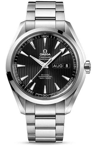 This classic yet robust timepiece represents a tribute to OMEGA's rich maritime heritage. The dramatic and easily-recognisable dial design of the OMEGA Seamaster Aqua Terra 150M collection recalls the wooden decks of luxury sailboats. This model features a black dial decorated with the Teak Concept pattern and month and date windows at the 3 o'clock position. A scratch-resistant sapphire crystal protects this unique dial. The bezel is mounted on a 43 mm stainless steel casebody on a stainless steel bracelet. This wristwatch is powered by the exclusive OMEGA Co-Axial calibre 8601.