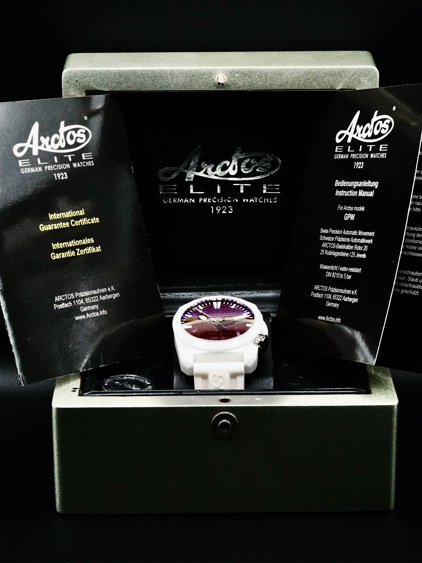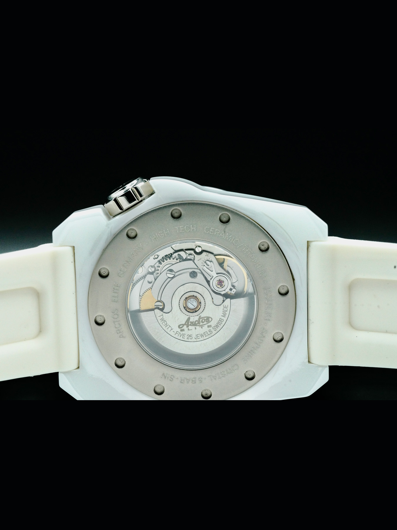 This Arctos Elite features a 44mm white ceramic case with a display case back on a white rubber strap. This watch also sports a brown dial with luminous hands and index dial markers covered by sapphire crystal. Self-winding movement with a power reserve of approximately 40 hours. Water resistance up to 50 meters.
