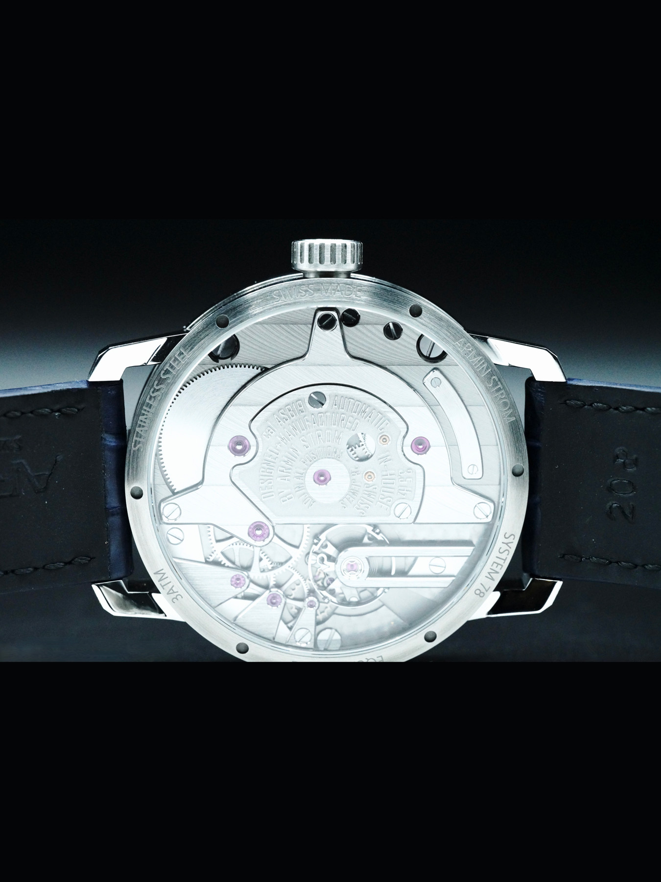 Automatic movement powered by Armin Strom Calibre ASB19 with a power reserve of approximately 72 hours. Water resistance up to 30 meters.