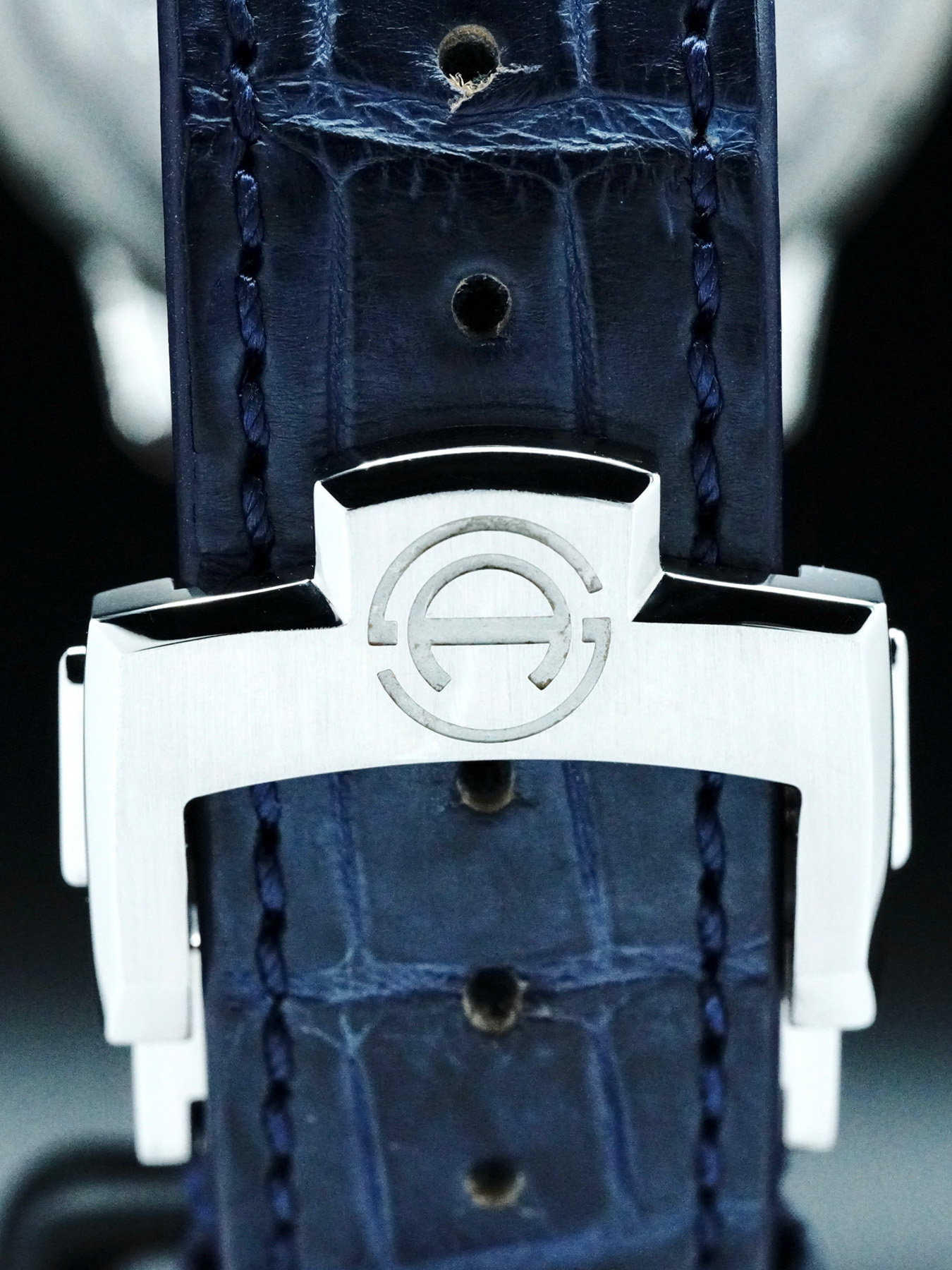 This Armin Strom Gravity Equal Force features a 41mm stainless steel case with an exhibition case back on a blue leather strap. This watch also sports a grey offset dial with a blue sub-dial with luminous hands and Arabic numeral dial markers covered by scratch resistant sapphire crystal.