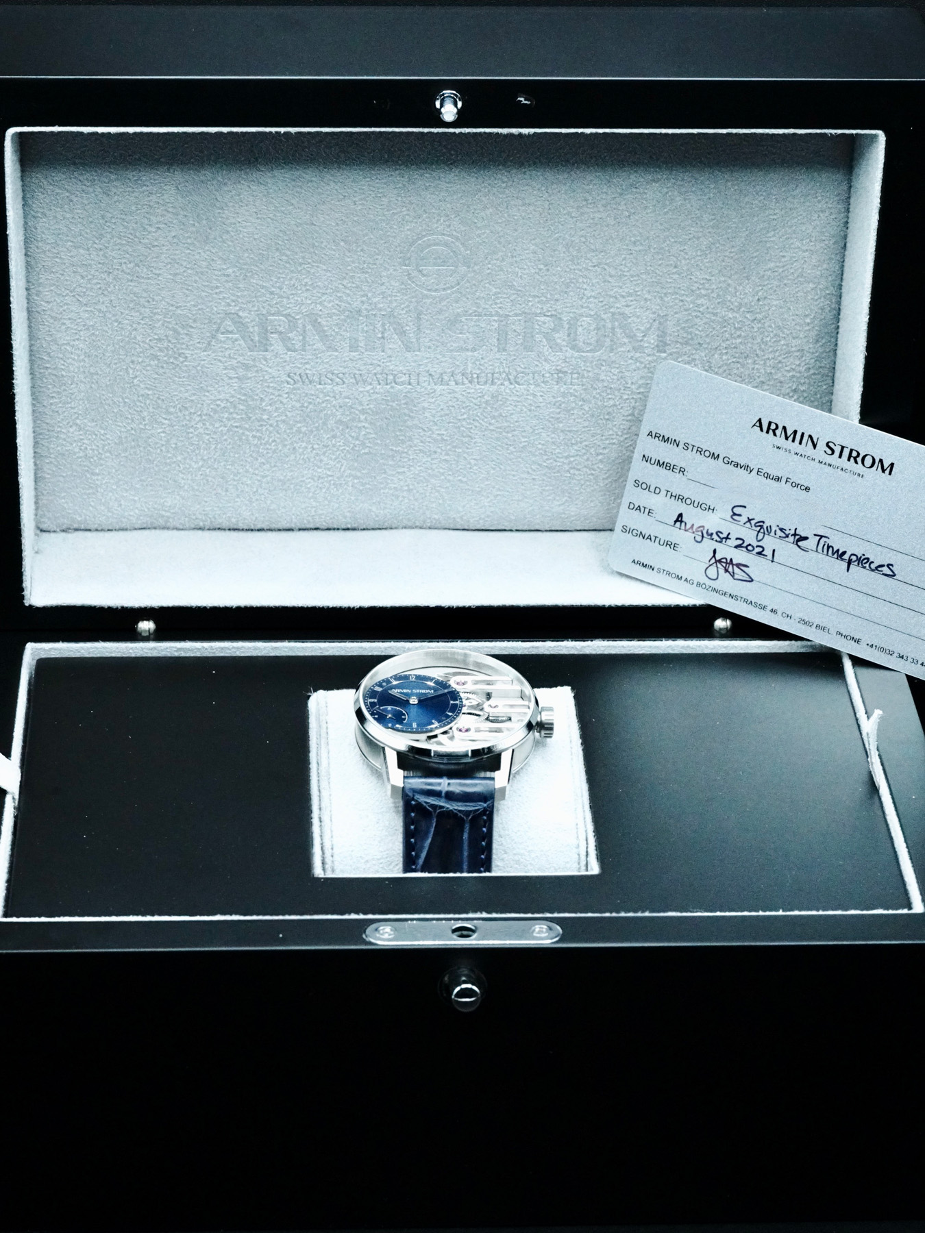 This Armin Strom Gravity Equal Force AS110-Ag-0221 is in EXCELLENT condition. This watch includes its original box and warranty card dated for August 2021. This watch has been fully authenticated and certified by Exquisite Timepieces.