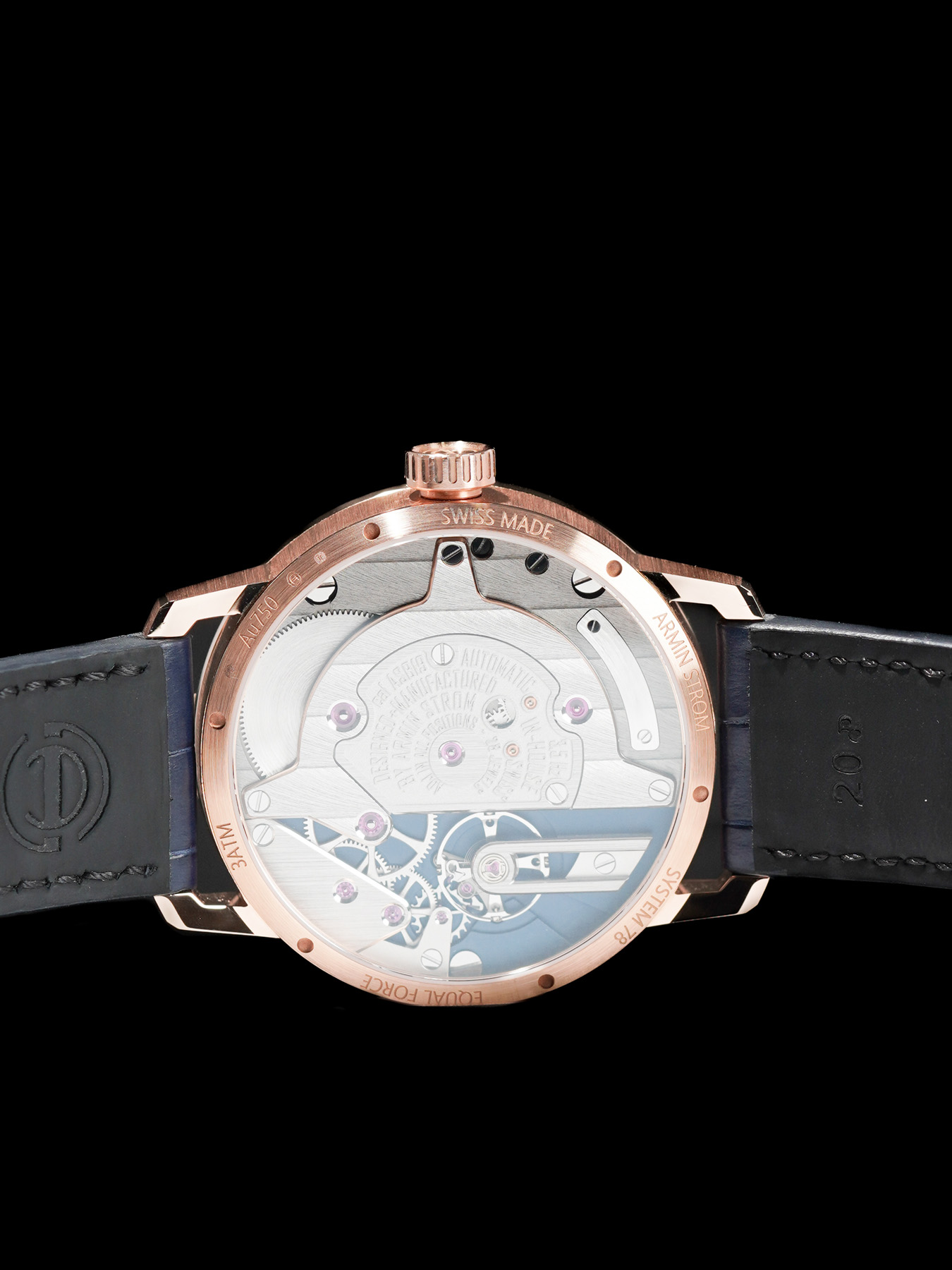 This Armin Strom Gravity Equal Force GEF Oster Blue Gold is in GREAT condition. This watch includes its original box, papers, and warranty card dated for 12/10/2024. This watch has been fully authenticated and certified by Exquisite Timepieces.