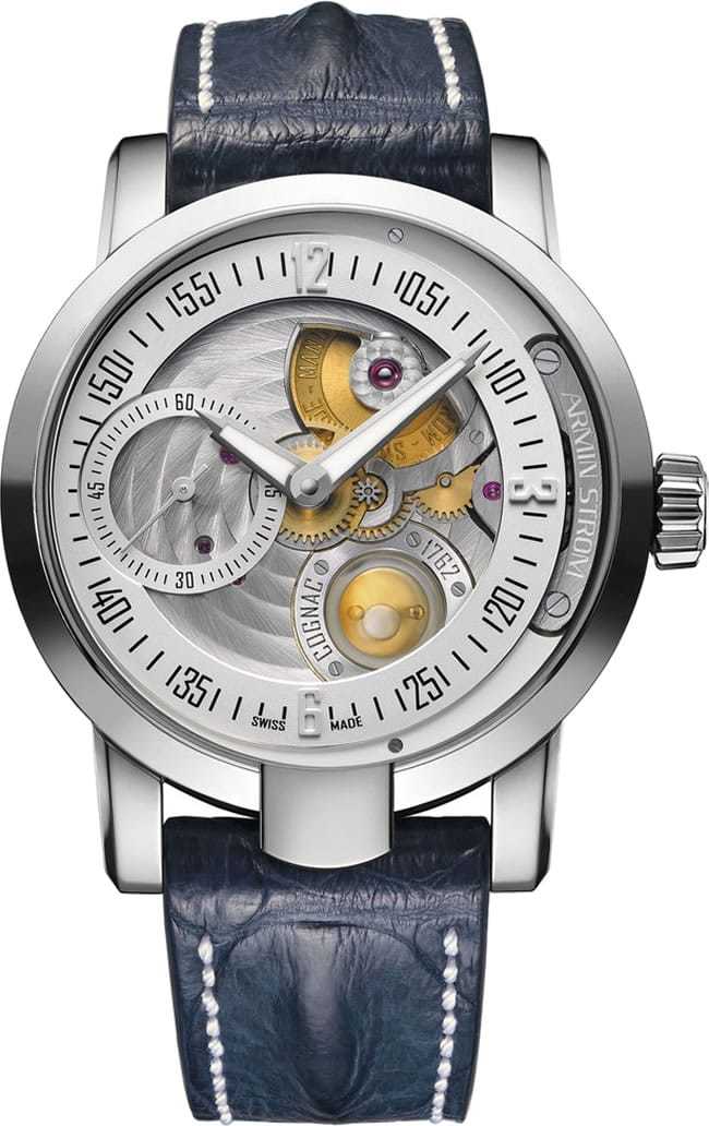 Armin Strom chief horologist Claude Greisler devised a concept that protects the movement while incorporating the rare spirit. A sealed sapphire crystal disc positioned at 5 o'clock captures the rare Cognac. Manual wind with a five-day power reserve, the watch will be produced in stainless steel, 18k rose gold and titanium cases. On the backside, a handengraved design of a bunch of grapes decorates the base plate.