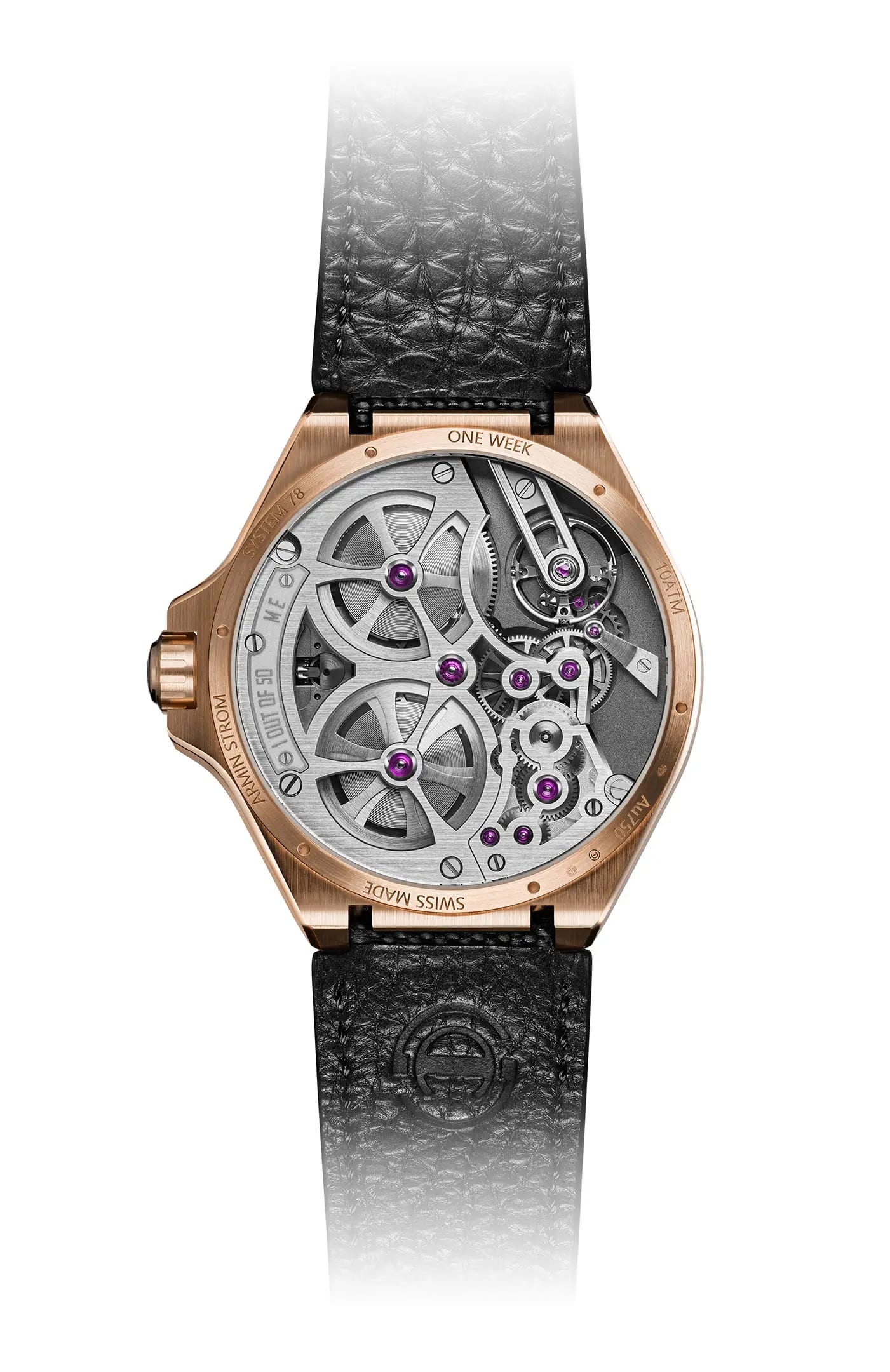 Every component of the Calibre ARM21 is decorated by hand, reflecting Armin Strom’s dedication to traditional craftsmanship. The two finger bridges are coated in a rose gold tone that enhances the depth of the open worked construction without overpowering it. Hand-polished bevels, Geneva stripes, circular graining and finely finished screw sinks demonstrate the brand’s uncompromising attention to detail – The skeletonisation brings the movement to life. Each One Week is assembled twice, a hallmark of the brand’s commitment to mechanical precision and aesthetic integrity.