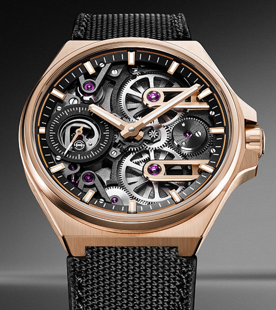 Its skeletonised architecture gives the watch a distinctive presence on the wrist.