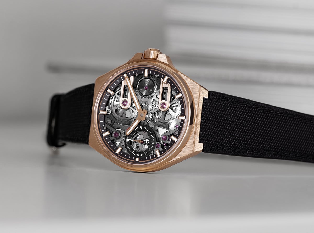 The One Week Skeleton Rose Gold is a tribute to Mr. Armin Strom’s pioneering artistry in skeletonisation – a craft that lies at the core of the brand’s philosophy and heritage. For the first time, the in-house calibre appears in a solid 18K rose gold case, enriching the collection with a warmer character. Rose gold coloured finger bridges, hands and applied indexes mirror the tone of the case, while a sleek black textile strap provides a refined modern contrast. Measuring 41 mm in diameter, the case remains compact and ergonomic and its skeletonised architecture gives the watch a distinctive presence on the wrist – a harmonious balance of technical craftsmanship and precious metal elegance.