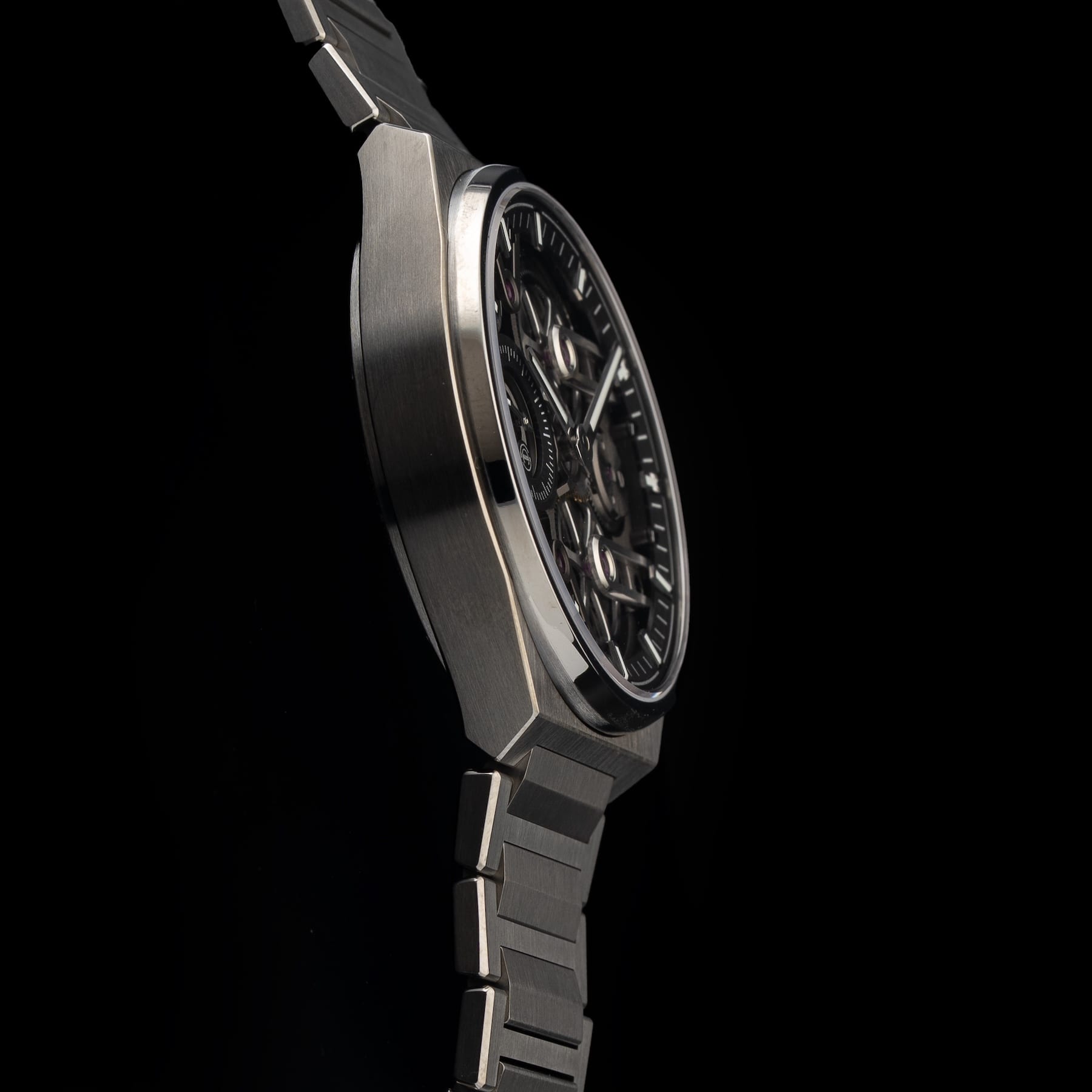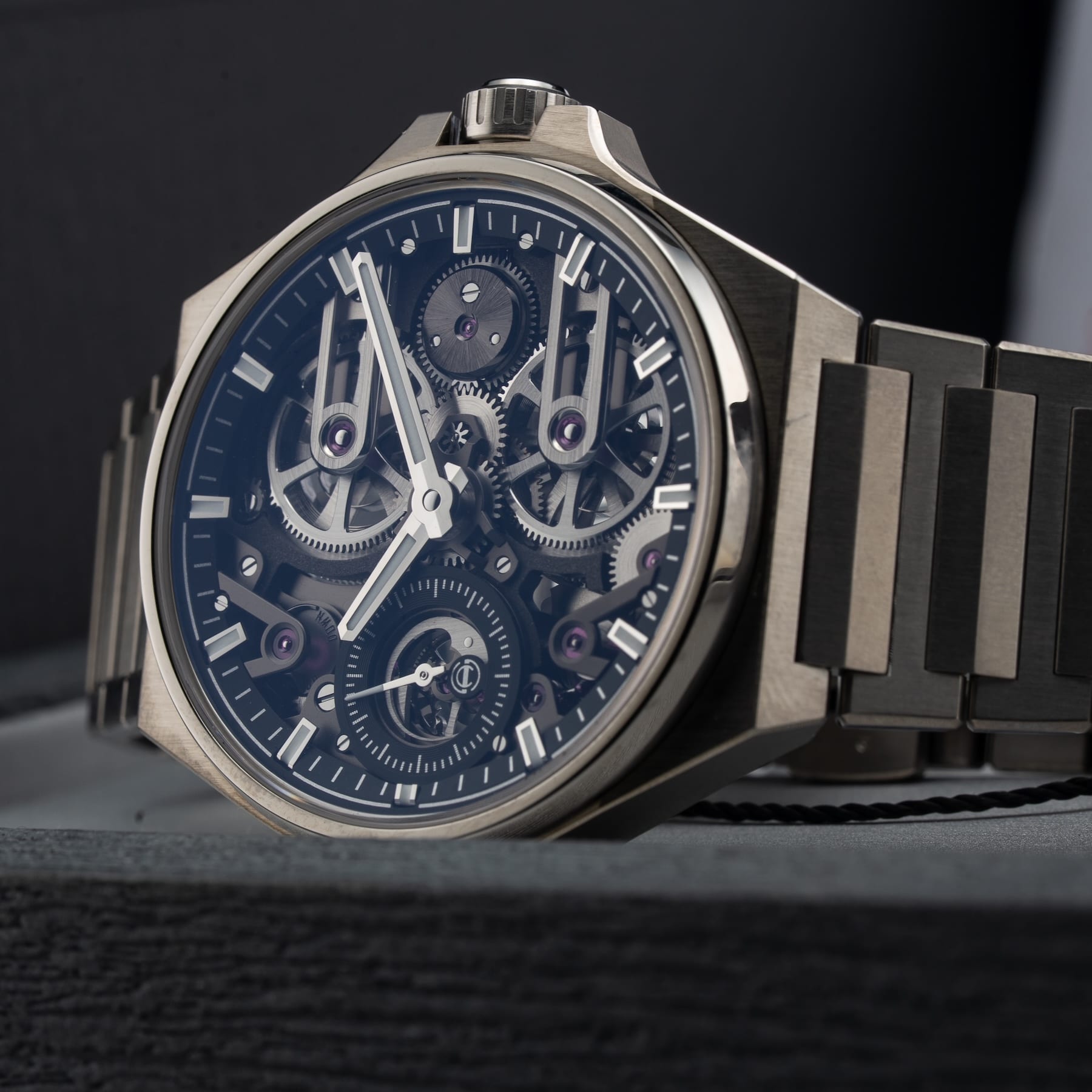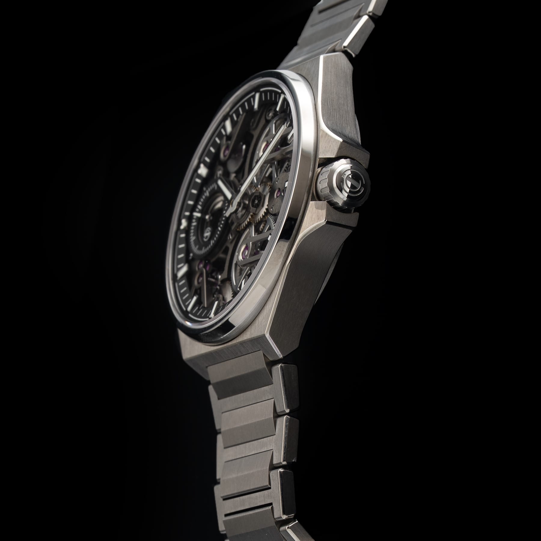This watch features a 41mm titanium case on titanium bracelet. This watch also sports a skeleton dial. Powered by a mechanical manual movement. Water resistance up to 100 meters.
