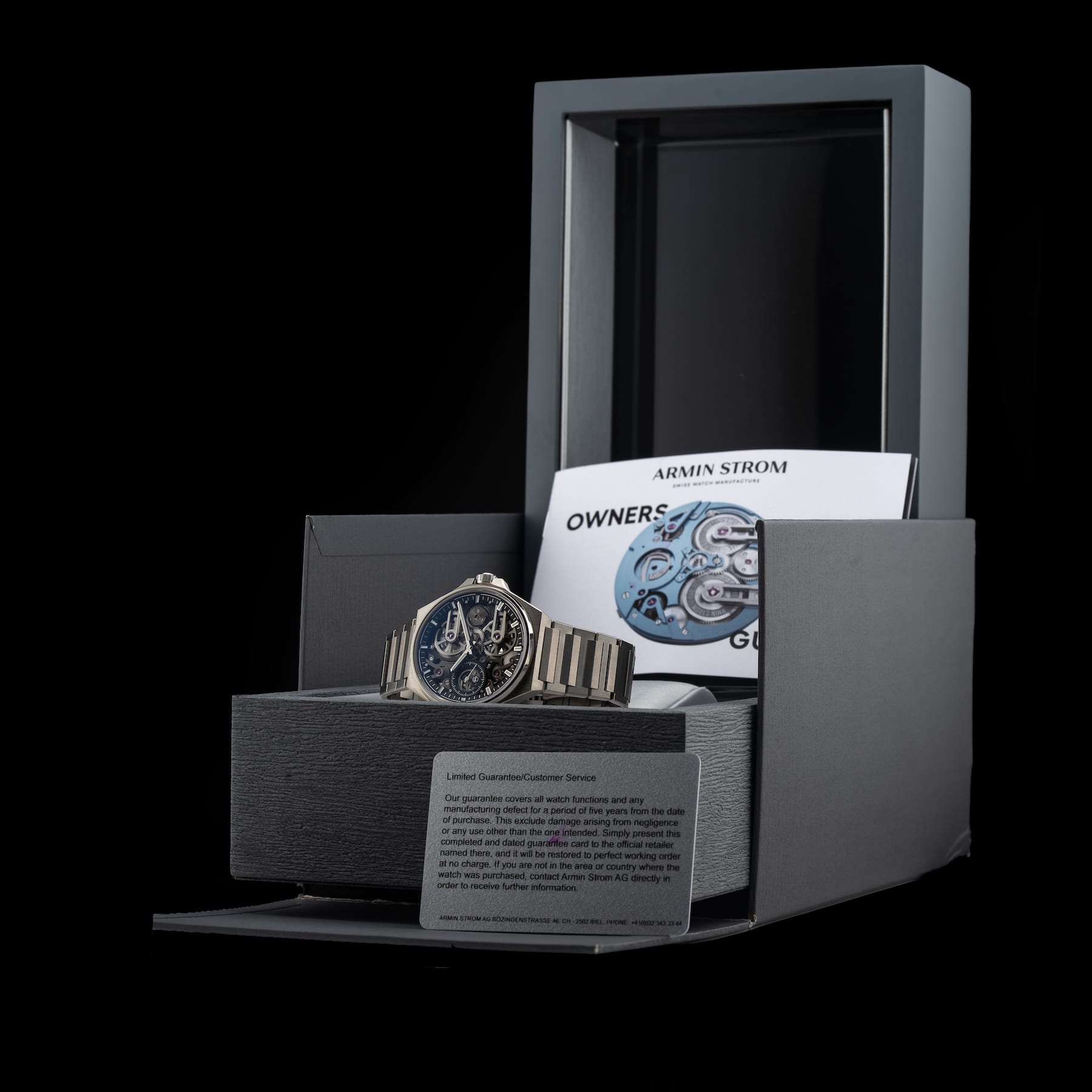 This Armin Strom TI25-OW.75 One Week Titanium Skeleton is in GREAT condition. This watch includes its Original Box, Original Papers and warranty card dated 08/25/2025. This watch has been fully authenticated and certified by Exquisite Timepieces. Please note, the photos shown are of the actual watch you will receive.