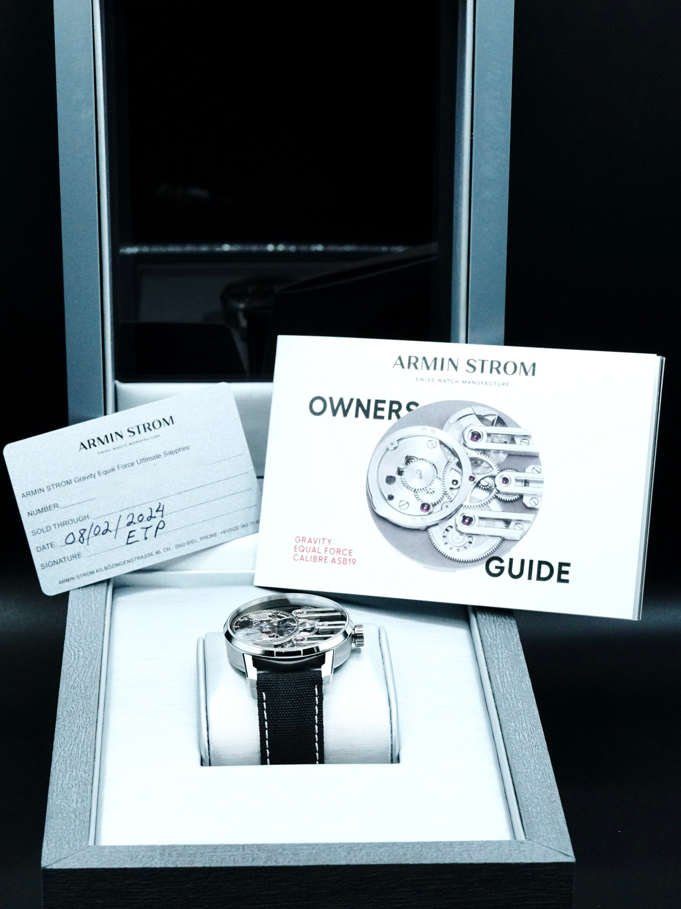 This Armin Strom Gravity Equal Force Ultimate Sapphire ST21-GEF.SA.VE.M.35.FC is in EXCELLENT condition. This watch includes its original box, instruction manual, and warranty card dated for 2024. This watch has been fully authenticated and certified by Exquisite Timepieces.