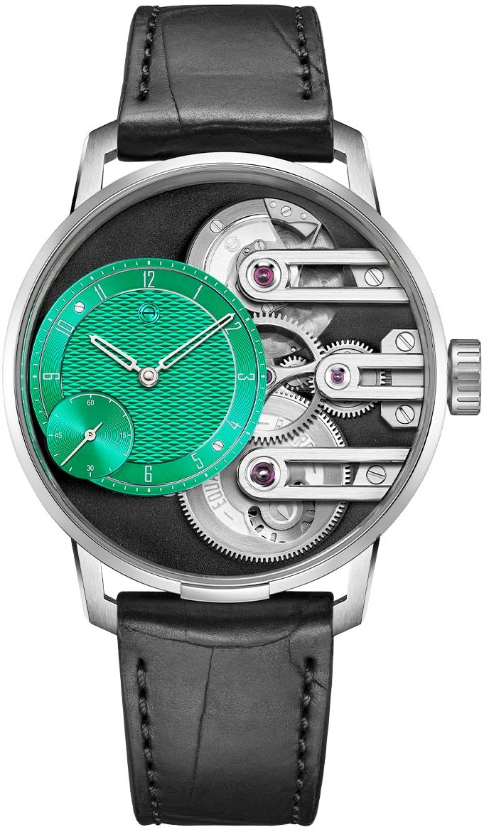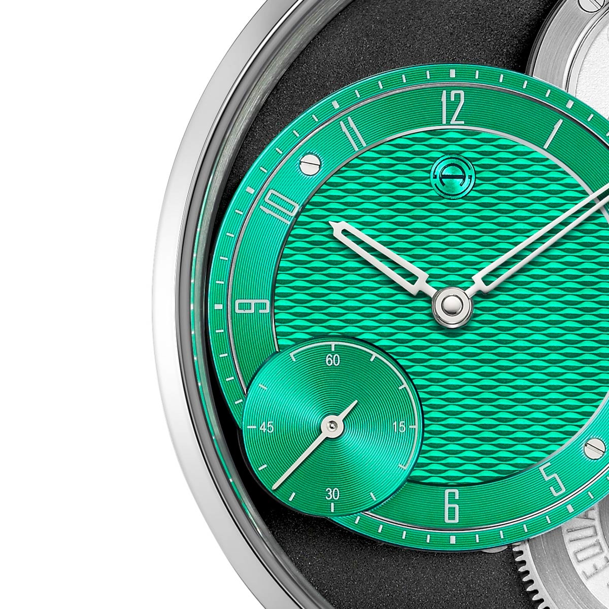 Adding a touch of traditional craftsmanship to an innovative and outstandingly designed watch, this Gravity Equal Force features a guilloché engraved dial in a modern and vibrant jungle-green colour that contrasts strikingly against the matte black movement plate. The dial is handcrafted by renowned independent watchmaker Kari Voutilainen’s atelier, using a manual rose engine lathe.
