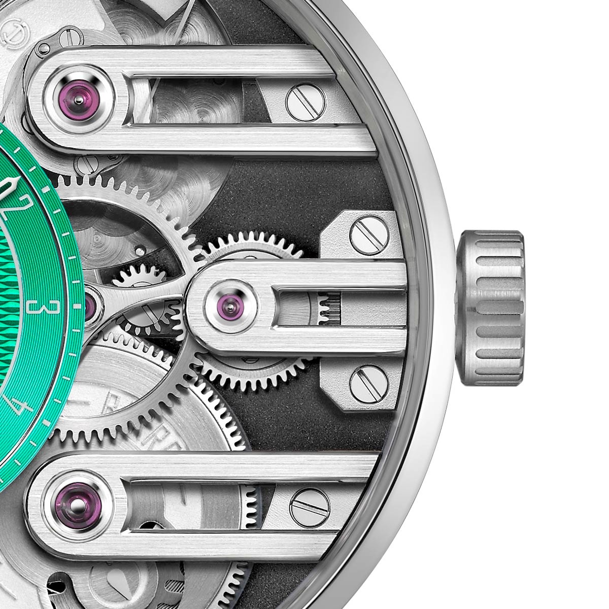 An unprecedented feat of micromechanical ingenuity with a singular design made even more spectacular by an artisanally crafted dial, the Gravity Equal Force Jungle Green features a striking jungle-green guilloché dial by Kari Voutilainen, with a Grain d’orge horizontal pattern that follows the lines of the three bridges, paired with a matte black movement plate.