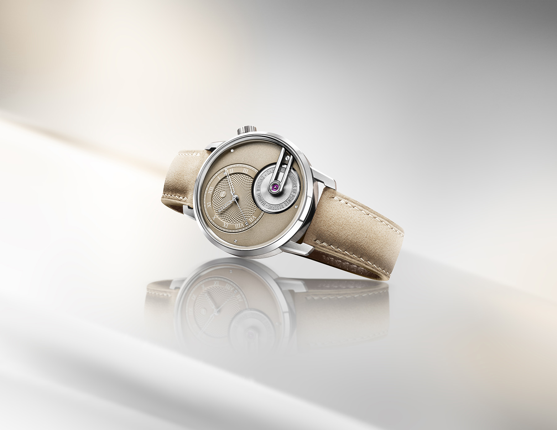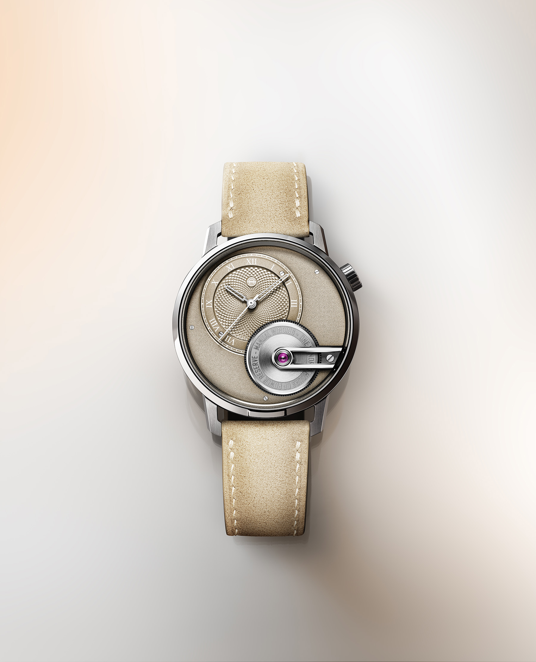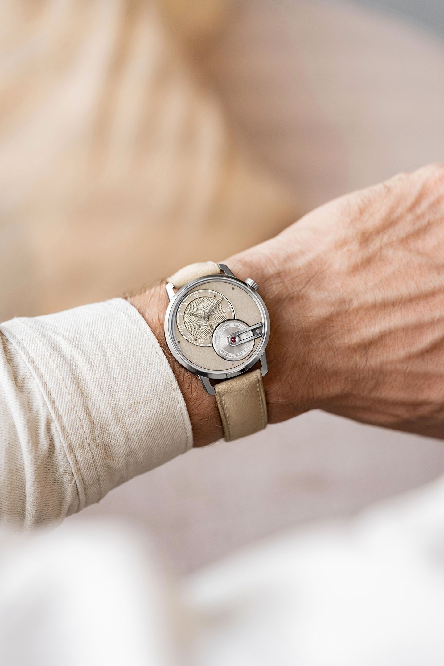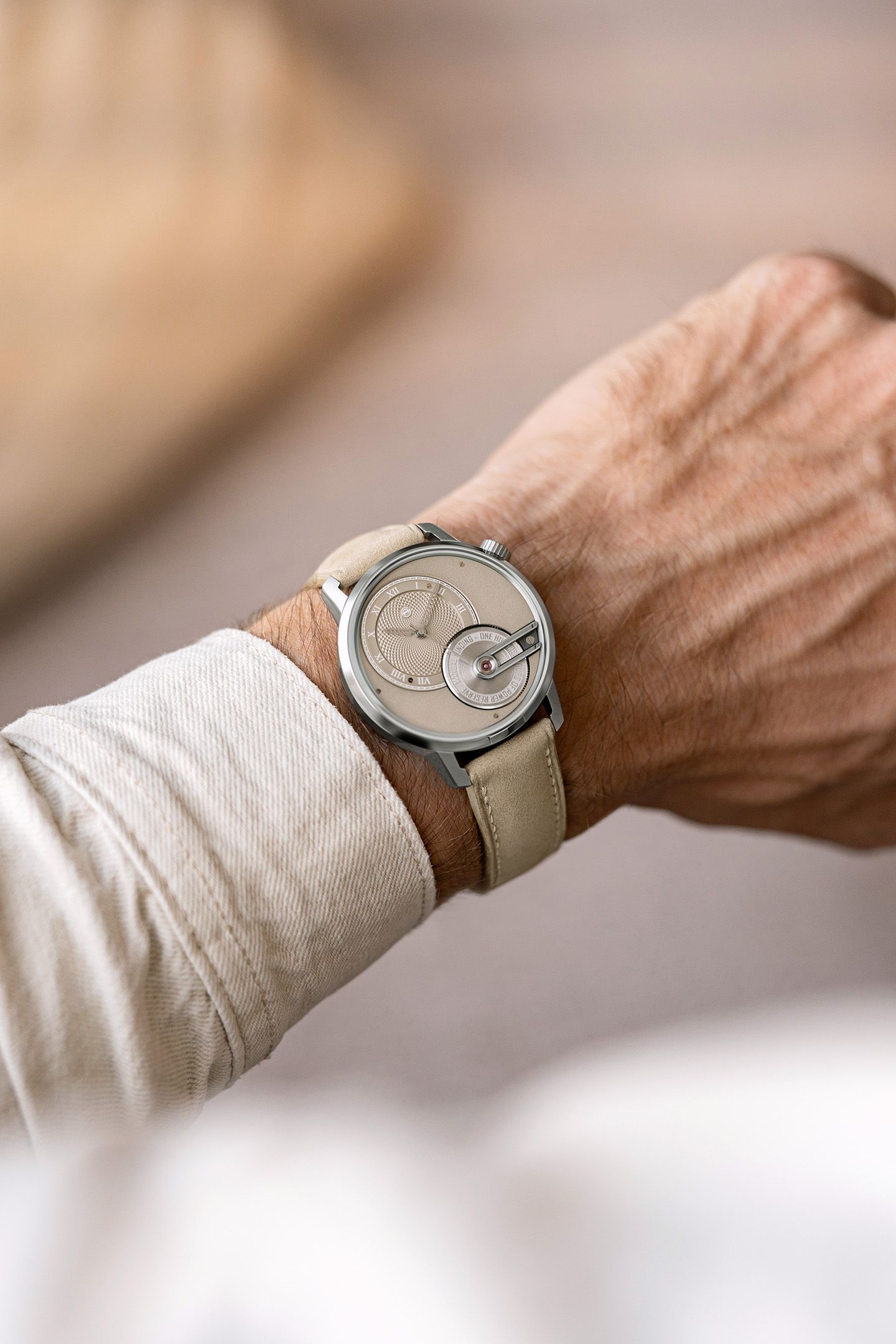 The Armin Strom Tribute 1 Sandstein is a refined 38mm stainless steel timepiece inspired by Burgdorf sandstone. Featuring an off-center sand-toned guilloché dial with Roman numerals, frosted subdial, and Alcantara strap, it houses the in-house Caliber AMW21 with 100-hour power reserve. Limited to 50 pieces, this hand-finished Swiss watch blends timeless elegance with modern mechanical artistry
