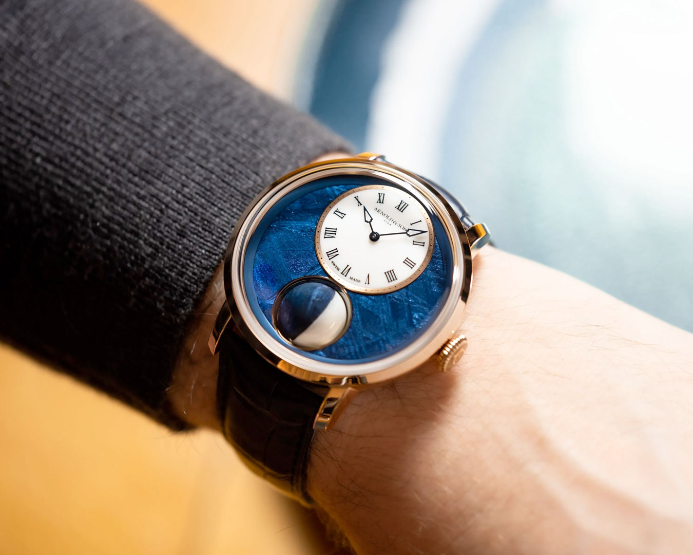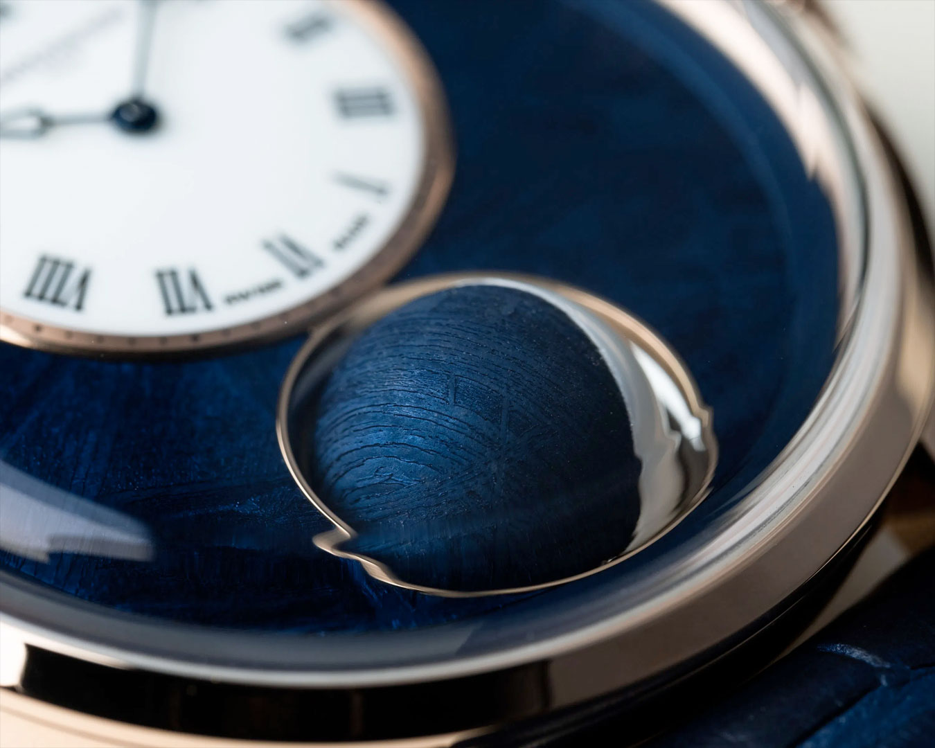 Its three-dimensional moon-phase complication gives it an astronomical feel, the 44 mm red gold case a terrestrial side, and the blue PVD-treated meteorite dial a stellar dimension. The largest of all moons receives a rare and precious new interpretation in dynamic hues.