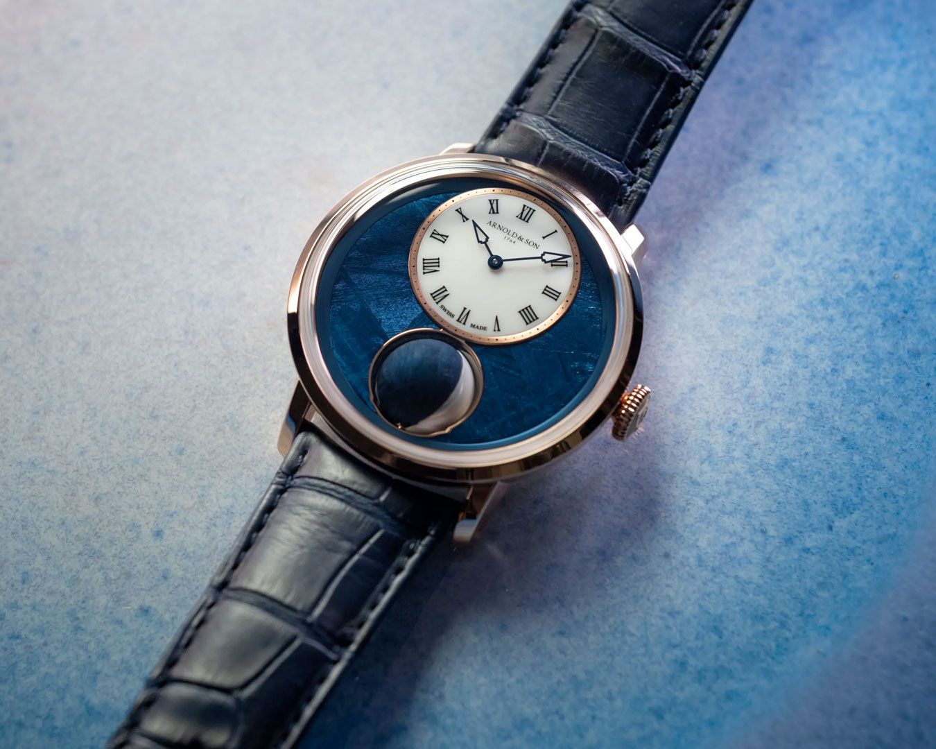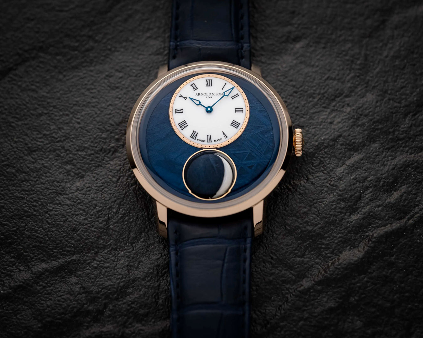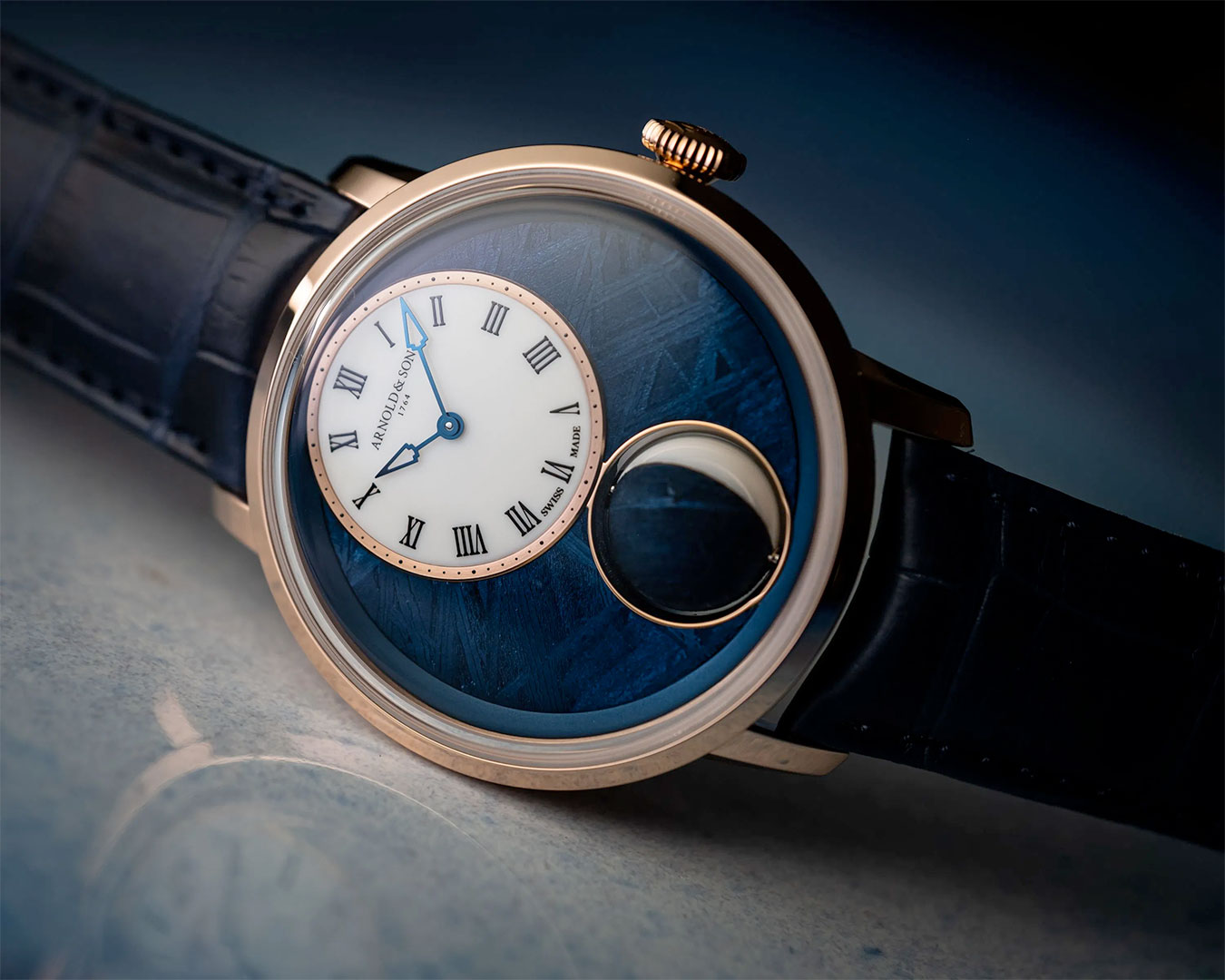 The sophisticated celestial mechanics are also based on precise astronomical reality. The duration of a complete lunar cycle is 29 days, 12 hours, 44 minutes and 2.8 seconds and Arnold & Son has managed to replicate it in such a way that it will take 122 years for the movement’s display to deviate from the correct celestial reading by one day. The correction required at this time will be easy to make, as the Luna Magna Red Gold Meteorite’s moon-phase function is directly accessible from the crown. This practical feature has been made possible by Arnold & Son’s total command of the watchmaking process.