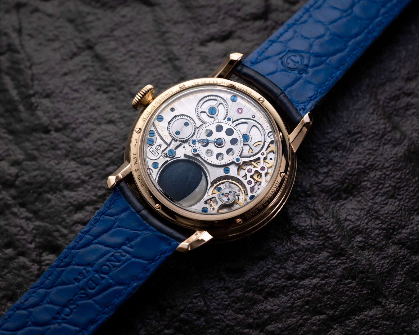 Luna Magna Red Gold Meteorite is driven by the A&S1021 calibre, which has been fully developed, machined, assembled and adjusted in the Arnold & Son Manufacture. This hand-wound calibre, which has been designed with the lunar globe in mind, features a 90-hour power reserve and a regulating organ oscillating at a frequency of 3 Hz. The movement also includes a secondary display detailing the age of the moon on the case-back side. Its clearly readable markings are designed for high-precision lunar adjustments.