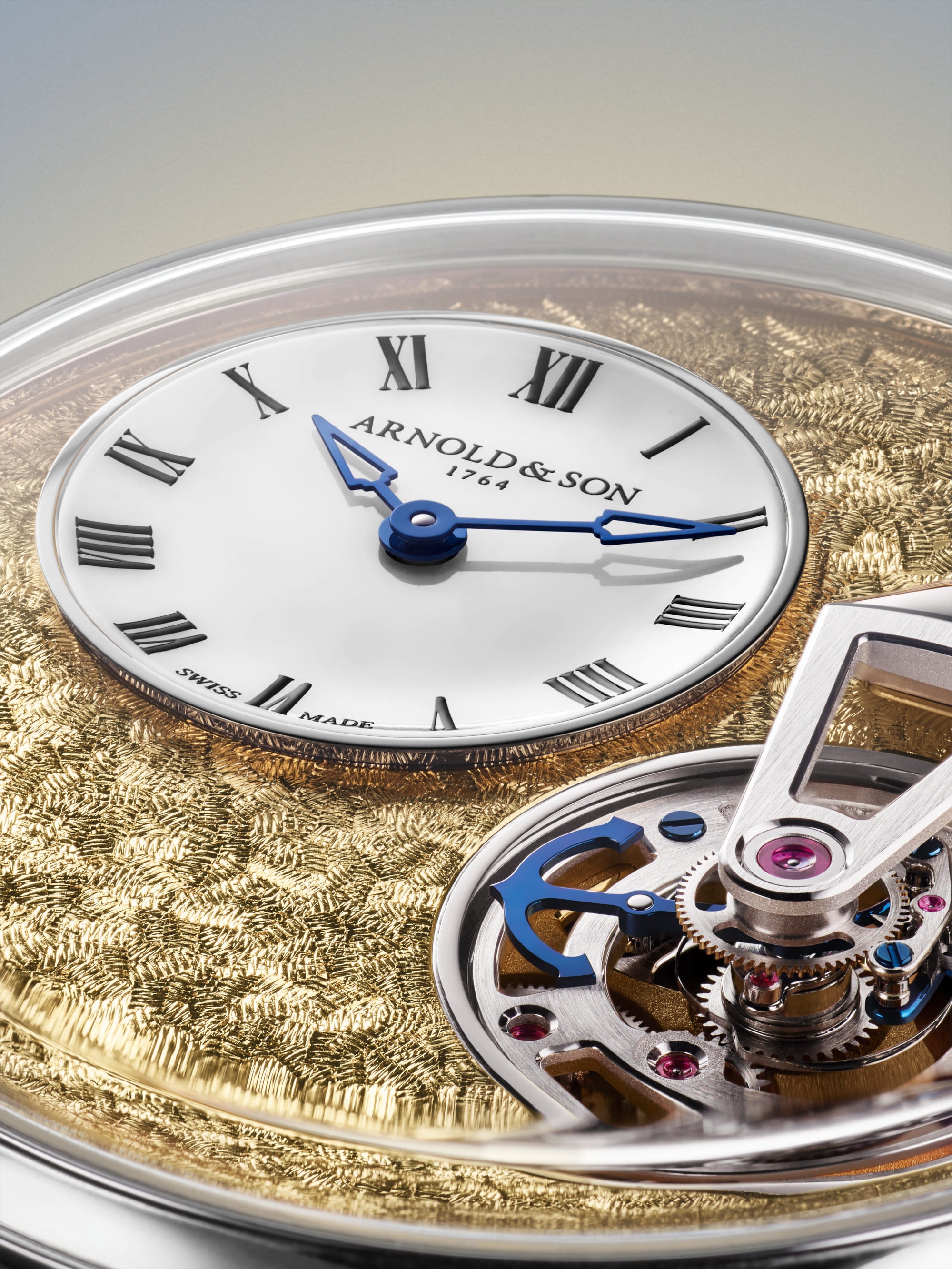 To ensure perfect isochronism throughout its 100-hour power reserve, Arnold & Son have positioned their patented constant force mechanism between the main gear train and the tourbillon. Visible on the dial, this ingenious system regulates the energy from the barrels, eliminating any variations in torque that could disturb the balance’s oscillation. Second after second, it rearms a finely adjusted spiral guaranteeing a completely stable transmission of energy to the tourbillon cage. The precise choreography of this constant force mechanism is magnified by an 18-carat gold bridge, emphasising the watchmaking excellence. The constant force mechanism replaces the group of components known as the “fusée-and-chain” that John Arnold used in his chronometers.