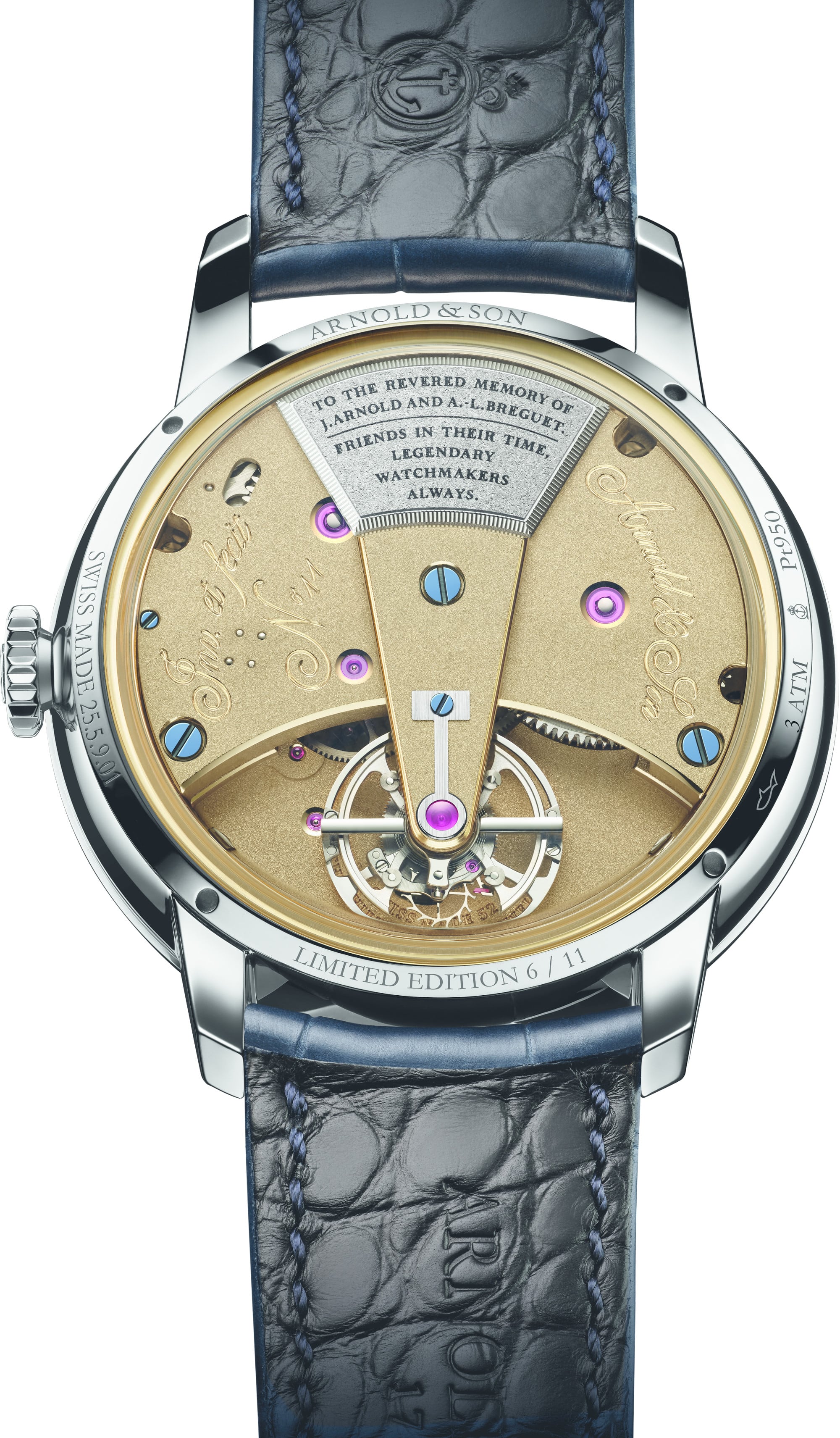 The finishing of the main plate, bridge and tourbillon cock is virtually identical to that of the very first tourbillon. To complete the tribute, Arnold & Son have included hand-engraved inscriptions on the barrel bridge and added the famous plate on which another homage has been engraved: “To the revered memory of John Arnold and Abraham-Louis Breguet. Friends in their time, legendary watchmakers always.”. This inscription definitively gives the Constant Force Tourbillon 11 its place in a unique historical saga: one in which the friendship between two geniuses gave rise to some of the most remarkable advances in chronometry.