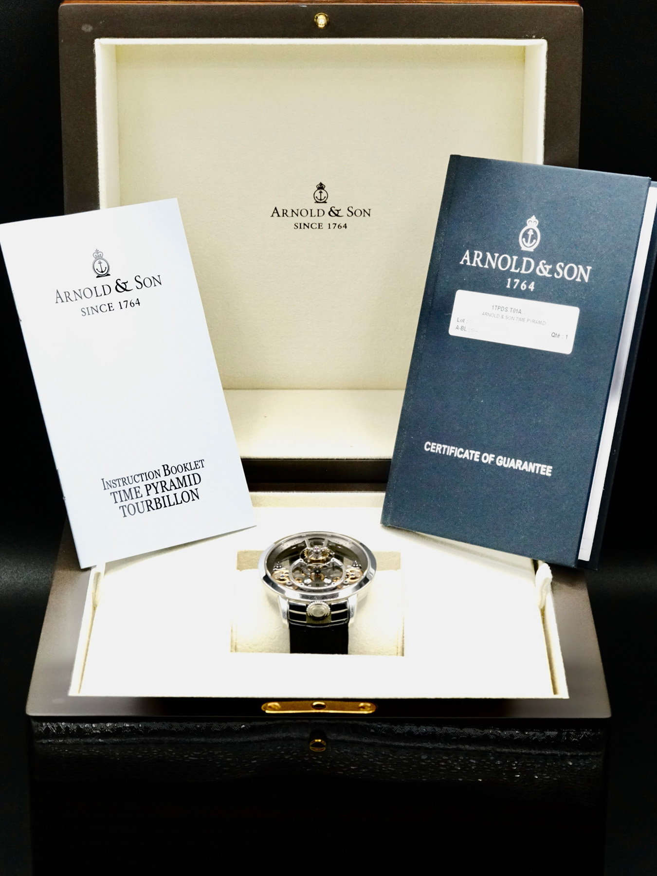 This Arnold & Son Time Pyramid Tourbillon 1TPDS.T01A is in EXCELLENT condition. This watch includes its original box, instruction manual, and warranty card not dated. Limited Edition of 28 pieces. This watch has been fully authenticated and certified by Exquisite Timepieces.
