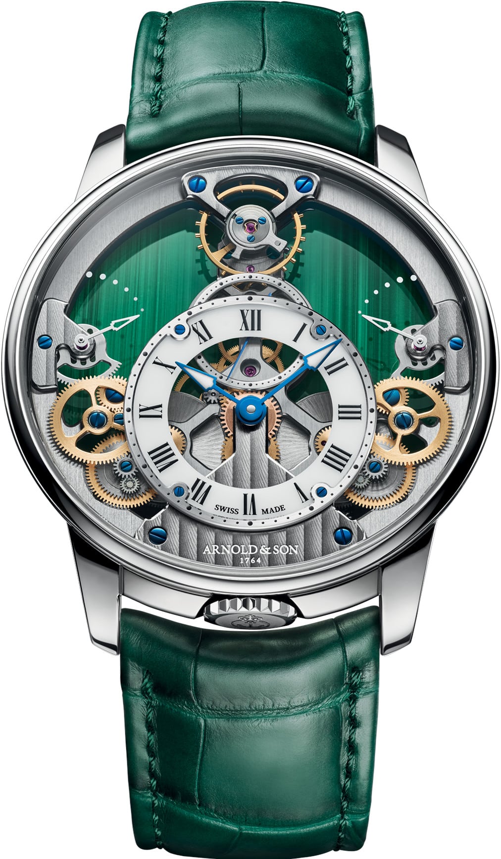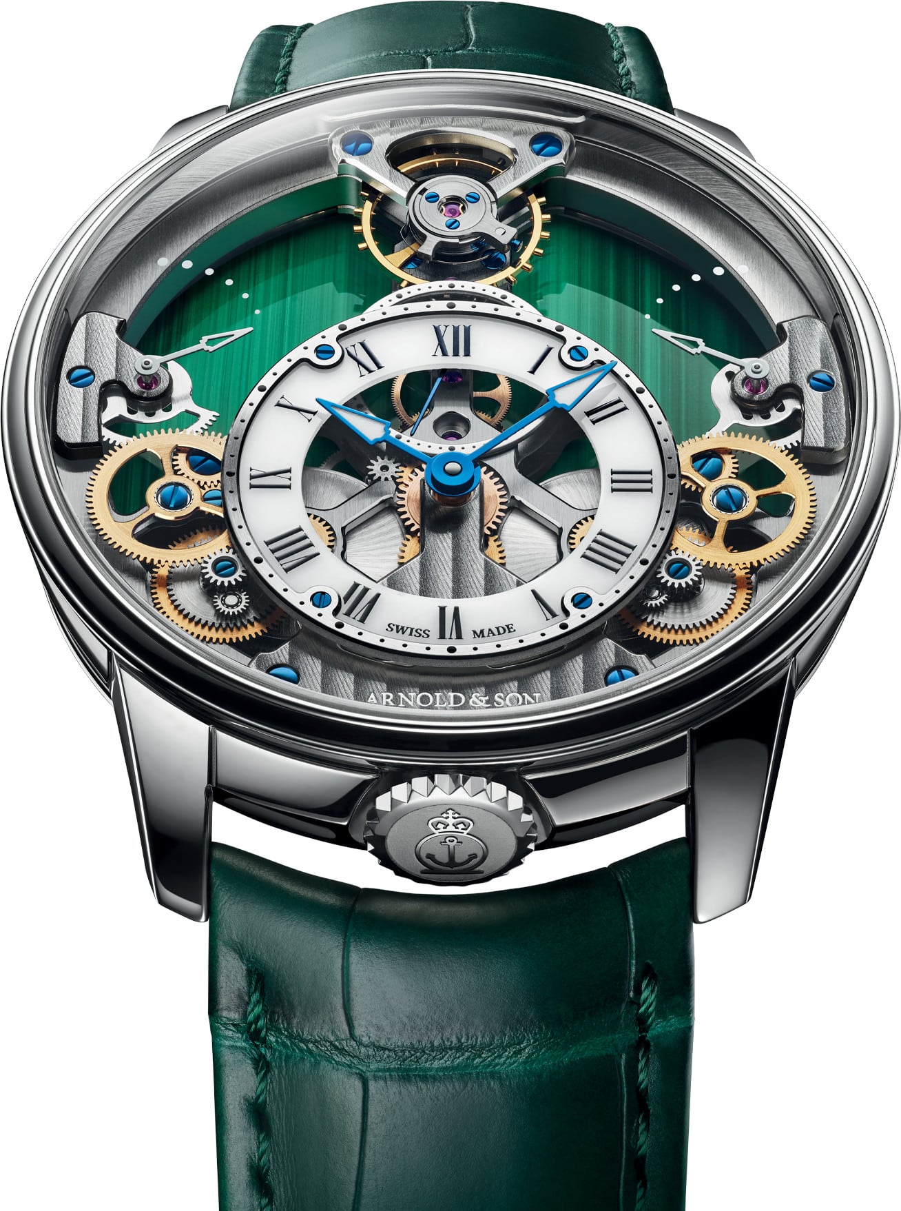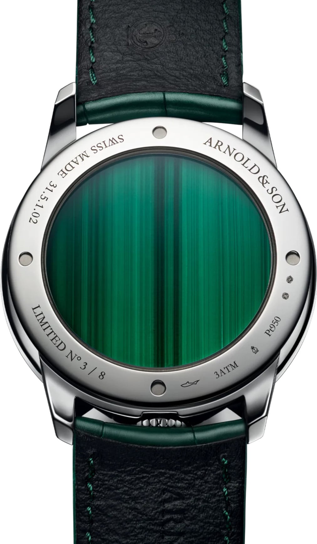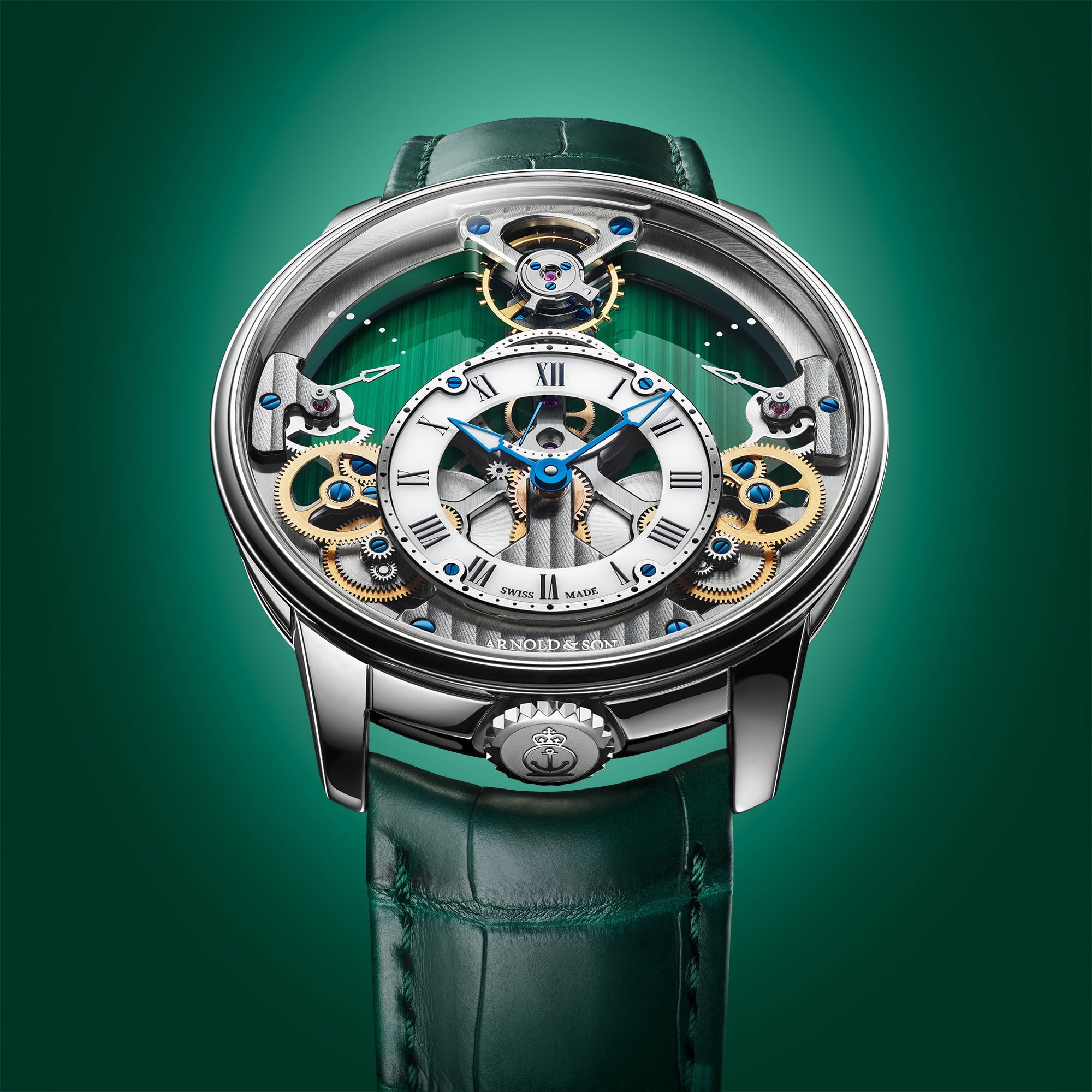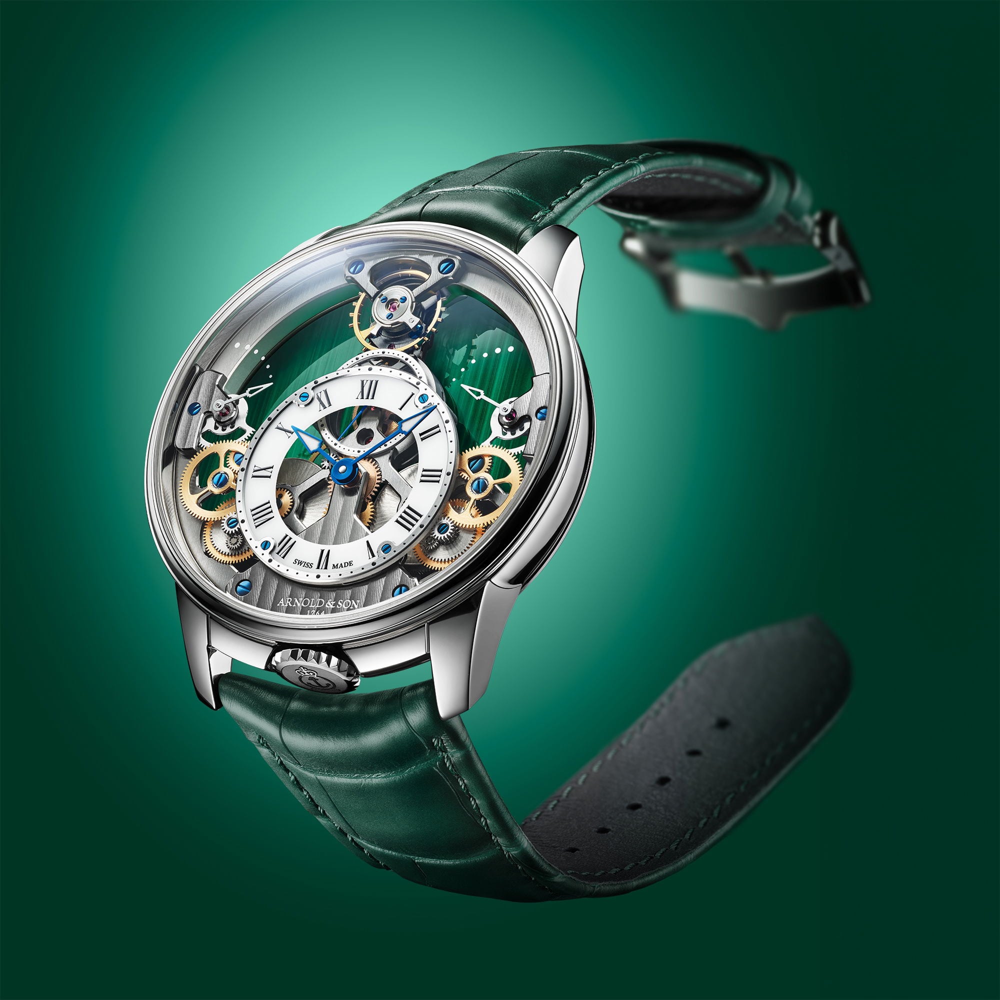 In recognition of its uniquely British watchmaking heritage, Arnold & Son presents a new iteration of its famous wristwatch, the Time Pyramid. The pyramid-shaped calibre of this new version appears to levitate inside the case, which is presented in a limited edition of eight pieces in 5N red gold and the same number in platinum. It unveils its magic with rare elegance, set against a disc of malachite – a fine stone in bewitching shades of green.