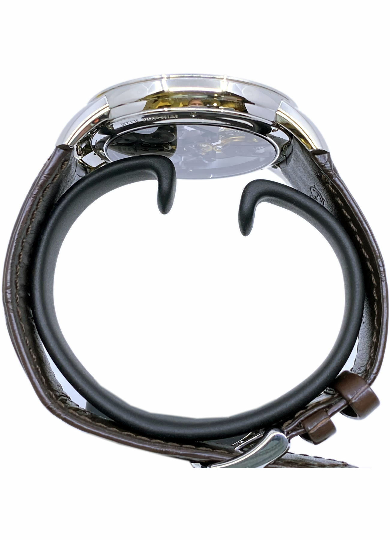 - This timepiece features a 44mm steel case paired with a high quality leather strap. It showcases a distinctive sapphire dial and is powered by a precise automatic winding movement.