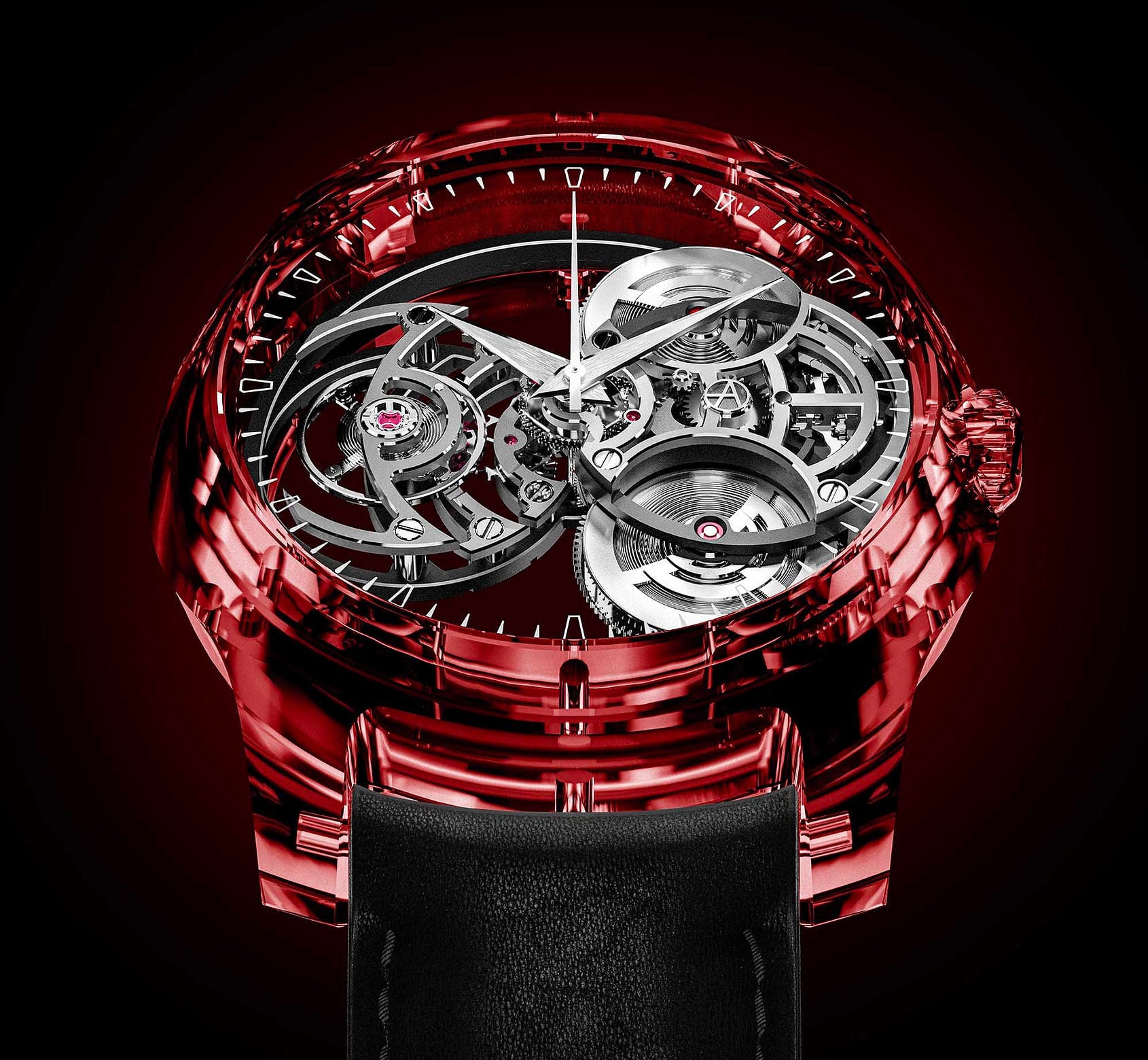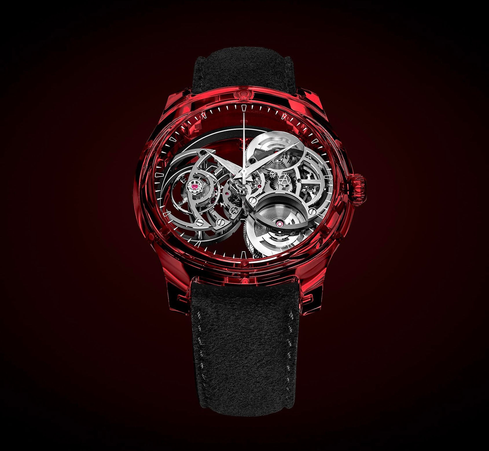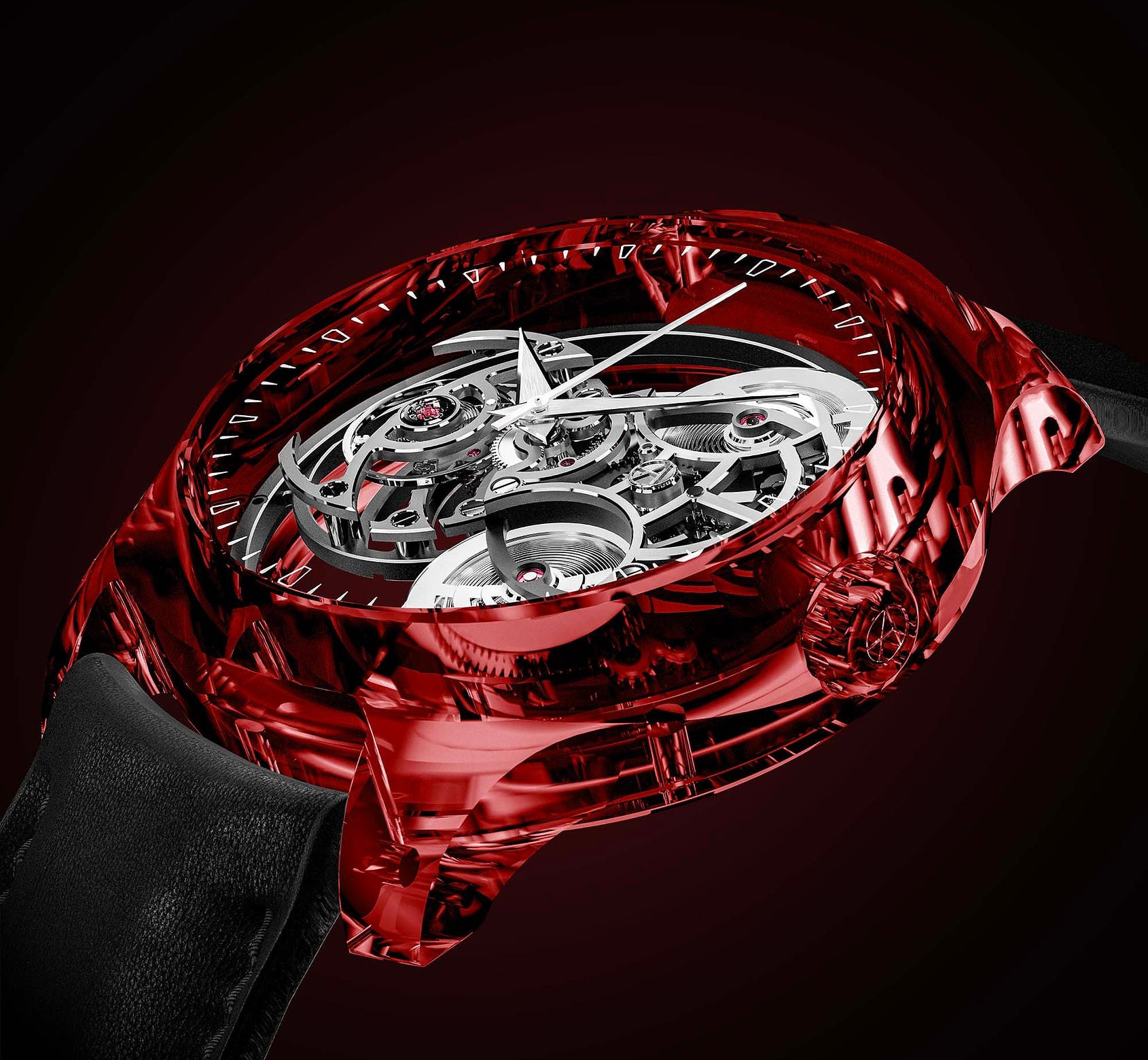 Crafted from exceptionally high-quality ruby-red sapphire, the case stands out with its intense red reflections and transparency, enhanced by the interplay of light. Paired with a minimalist dial, it highlights the balance between the natural beauty of the precious stone and mechanical ingenuity.