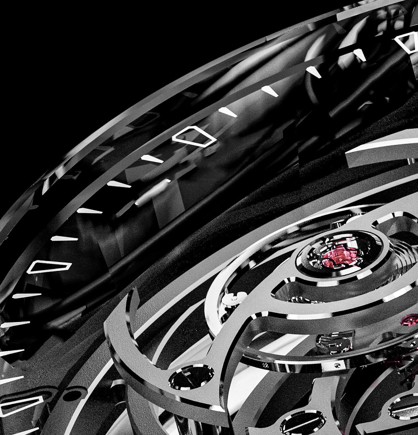 Again, art and functionality blend together perfectly in this latest watch creation by ArtyA. This design features a new chapter ring that further enhances the transparency of the entire piece : laser-engraved inside the upper crystal, it offers both perfect legibility and an unobstructed view of the movement.