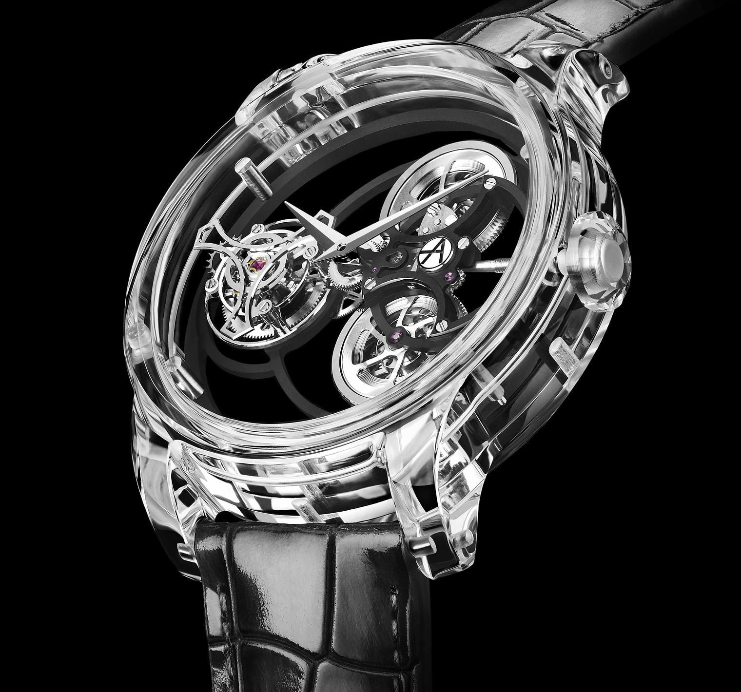 Encased in a full transparent pure sapphire case with an anti-reflective treatment, this timepiece allows an unobstructed view of its mesmerizing movement.