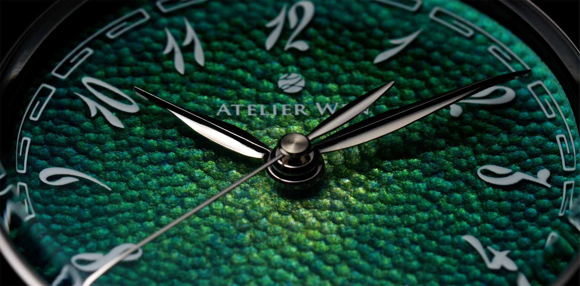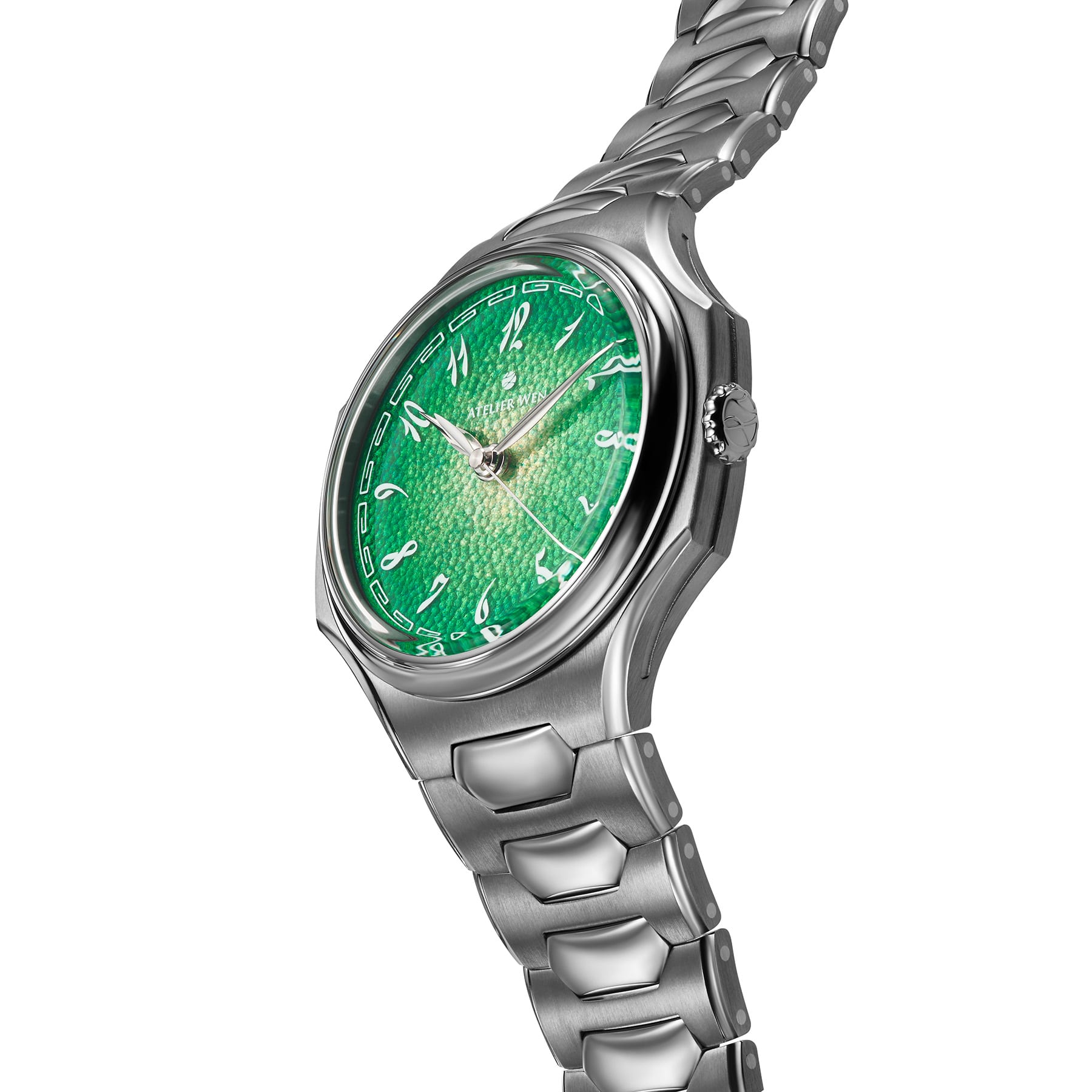 The launch edition, 幽 (Yōu), exhibits a grand feu enamel on a hand-hammered 925-silver dial base with a fumé finish ranging radially from a pale green to a rich viridian on a hand-hammered silver dial base. The dial is elevated by white Arabic hour markers and rhodium-plated bi-planed leaf hands.