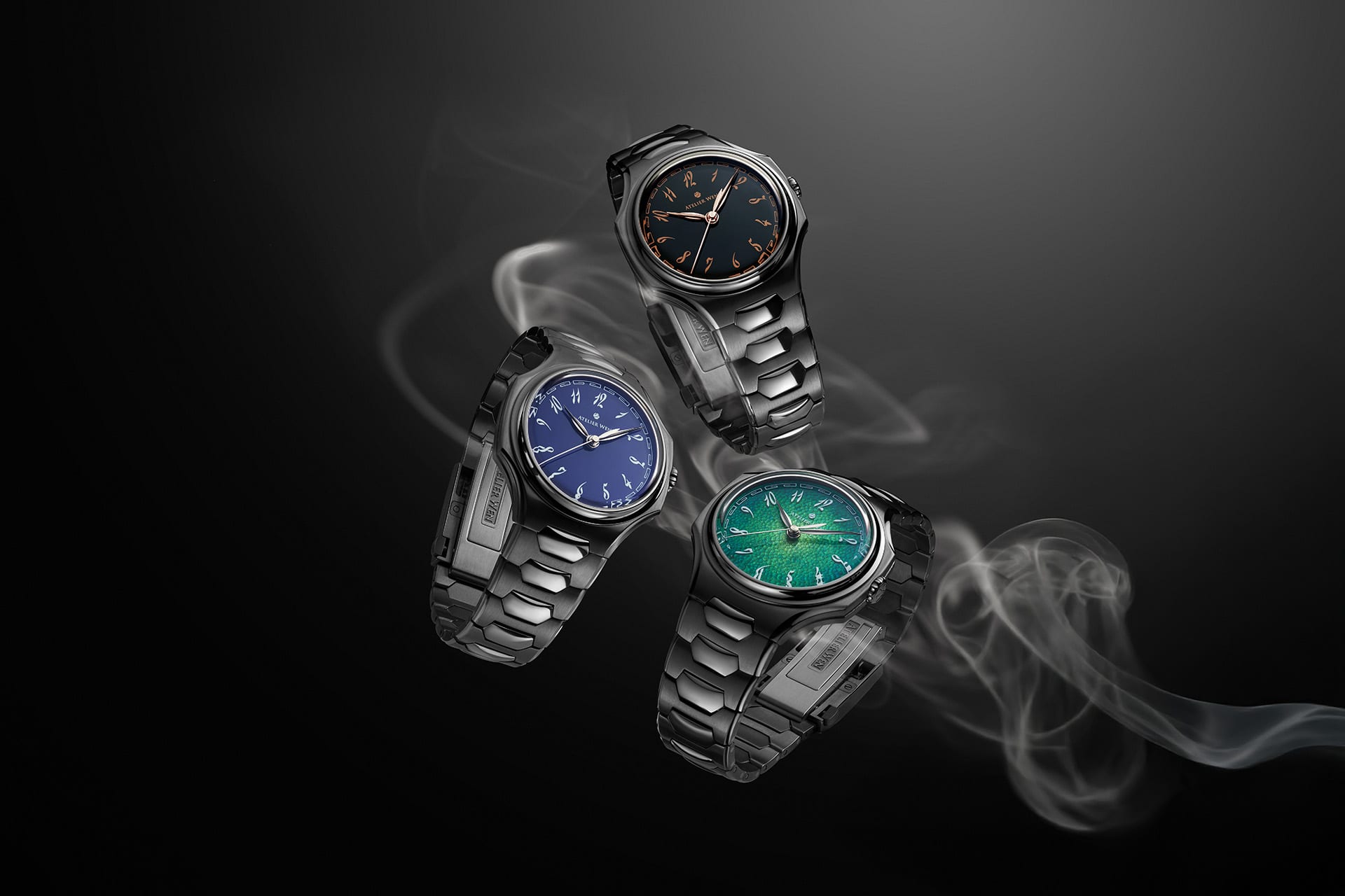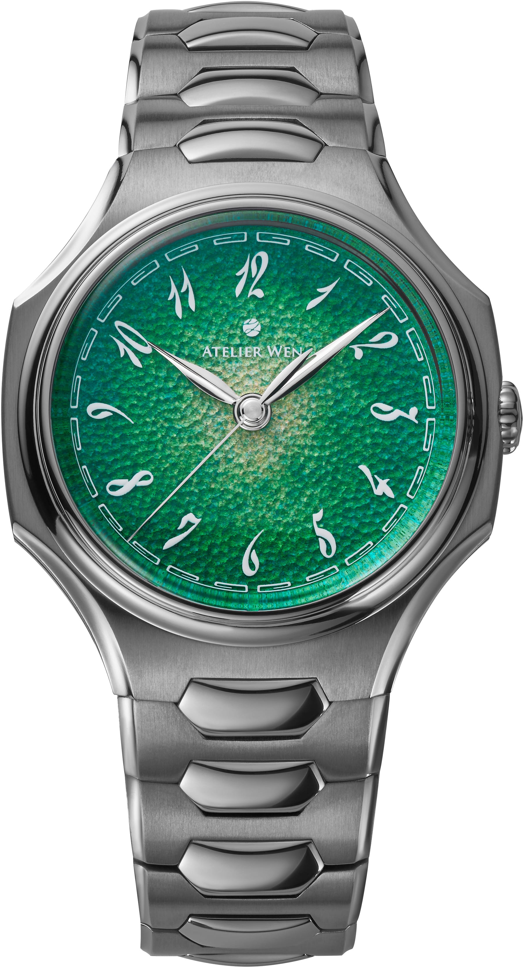 Atelier Wen is proud to present Inflection, the first permanent collection of integrated bracelet watches in 99.9% pure tantalum. Available in 3 variants featuring grand feu enamel dials, a launch edition in a viridian fumé on a hand-hammered dial, 幽 (Yōu), and two permanent editions, 墨 (Mò) in obsidian black dial and 渊 (Yuān) in midnight blue dial.