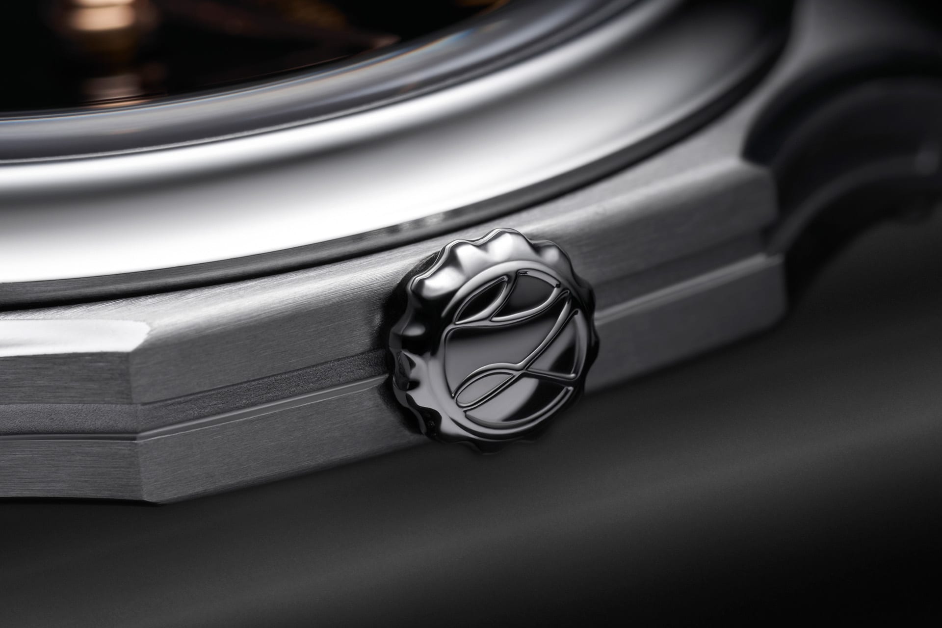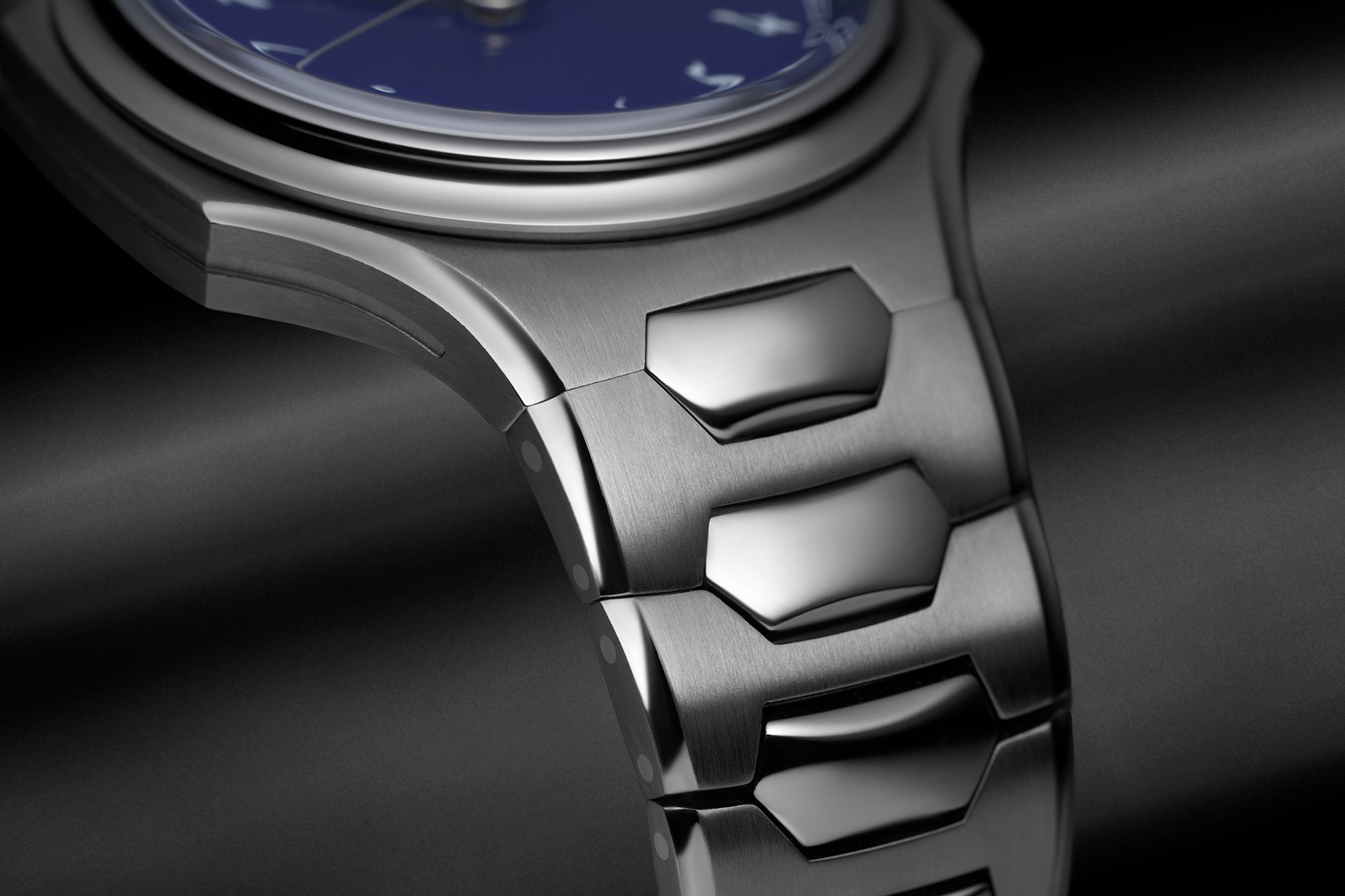 Designed by Alfred Chan, Inflection's design is rooted primarily in the use of curvature. Capturing the mesmerising blue-grey sheen of tantalum, the case and bracelet are finished in concave and convex edges. To amplify the beauty of the metal, it is also executed in a high degree of finishing of varied alternations of brushed, frosted and mirror-polished surfaces.