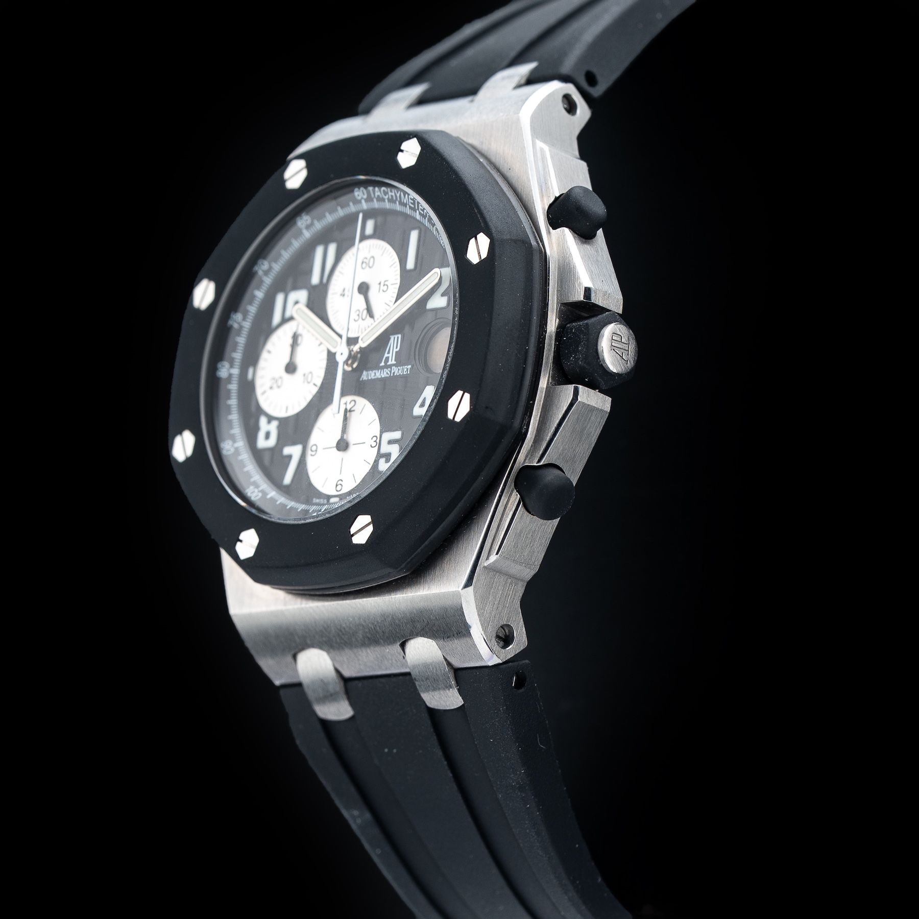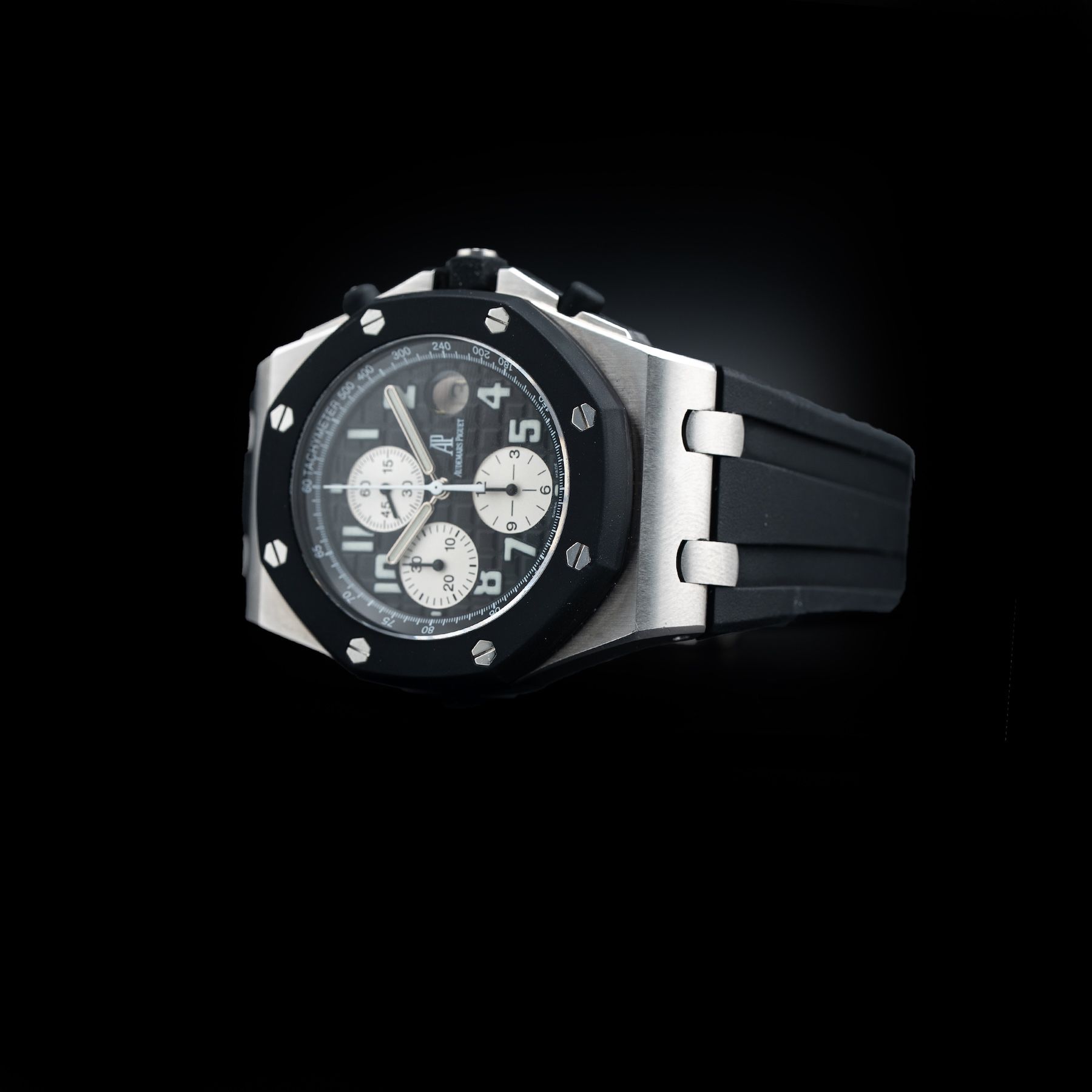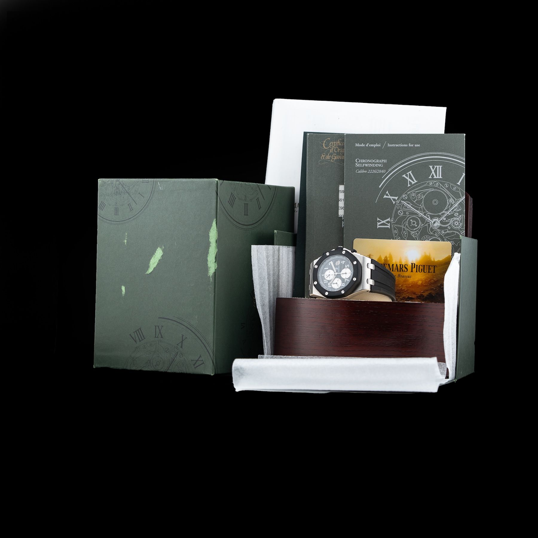 This Audemars Piguet 25940SK.OO.D002CA.01 Royal Oak Offshore Chronograph is in GREAT condition. This watch includes its Original Box, Original Papers and Warranty Card Dated 02/18/2005. This watch has been fully authenticated and certified by Exquisite Timepieces. Please note, the photos shown are of the actual watch you will receive.