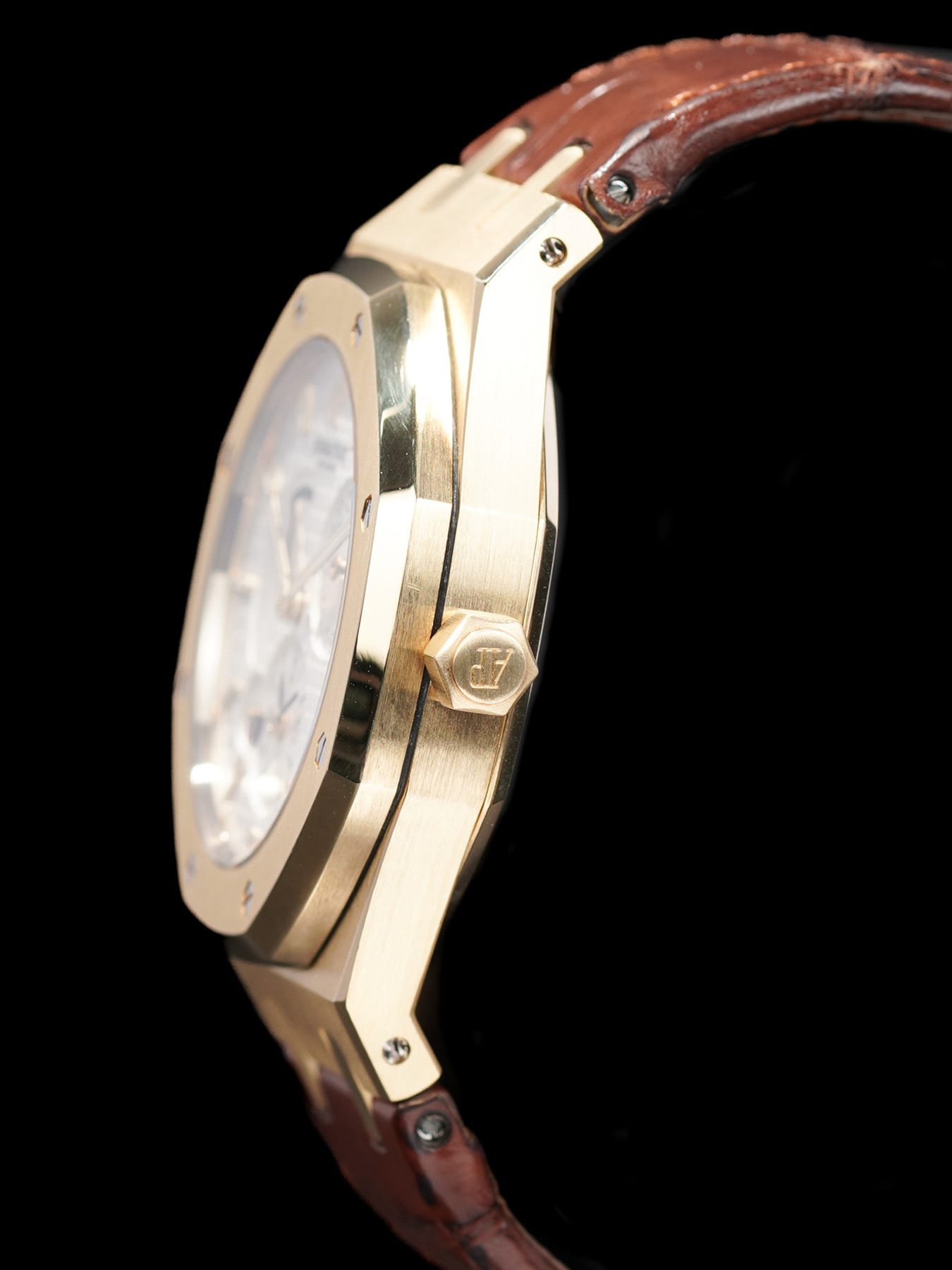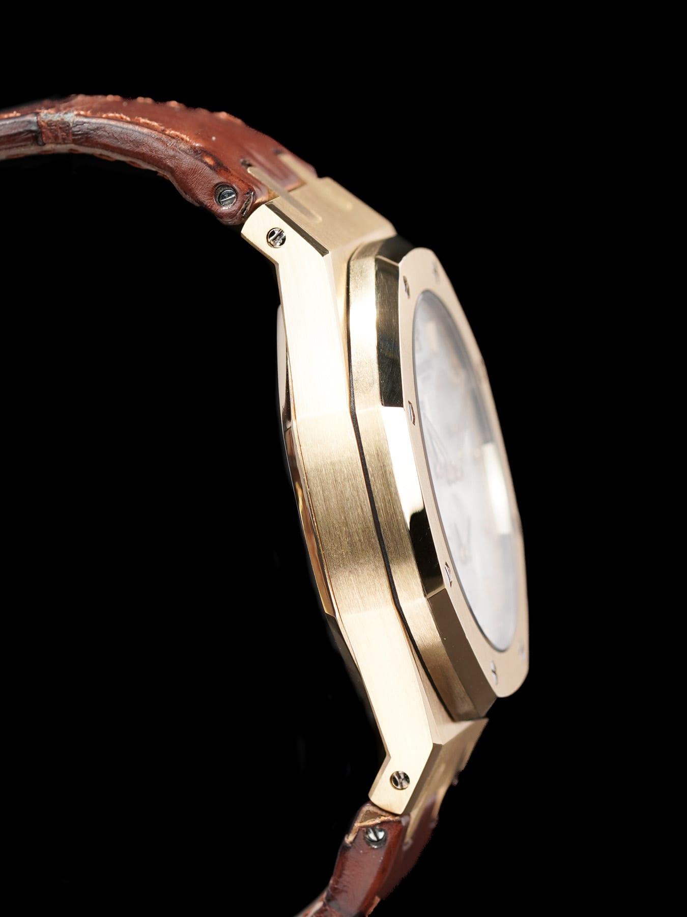 This watch features a 39mm yellow gold case on leather strap. This watch also sports a silver dial. Powered by an automatic movement. Water resistance up to 50 meters.