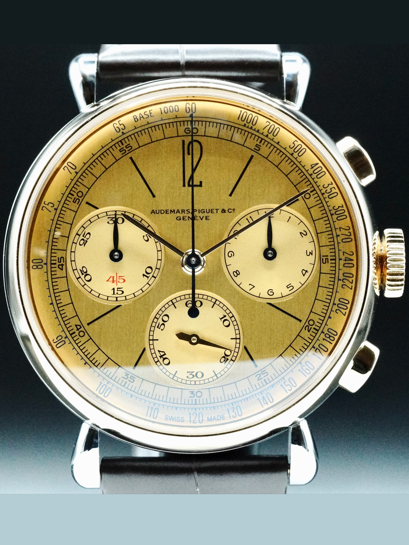This Audemars Piguet [Re]Master01 features a 40mm stainless steel case with an 18k pink gold bezel on a brown leather strap. This watch also sports a yellow gold-toned dial with pink-gold hands and index dial markers covered by scratch resistant sapphire crystal.