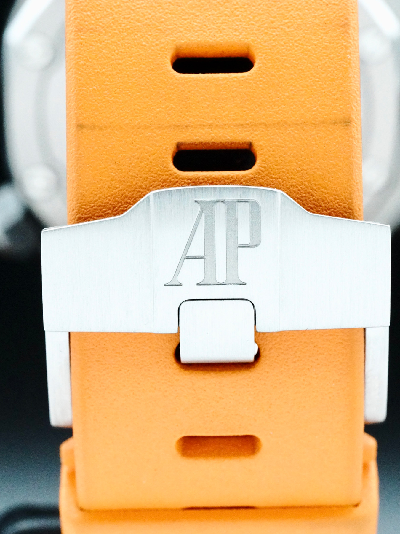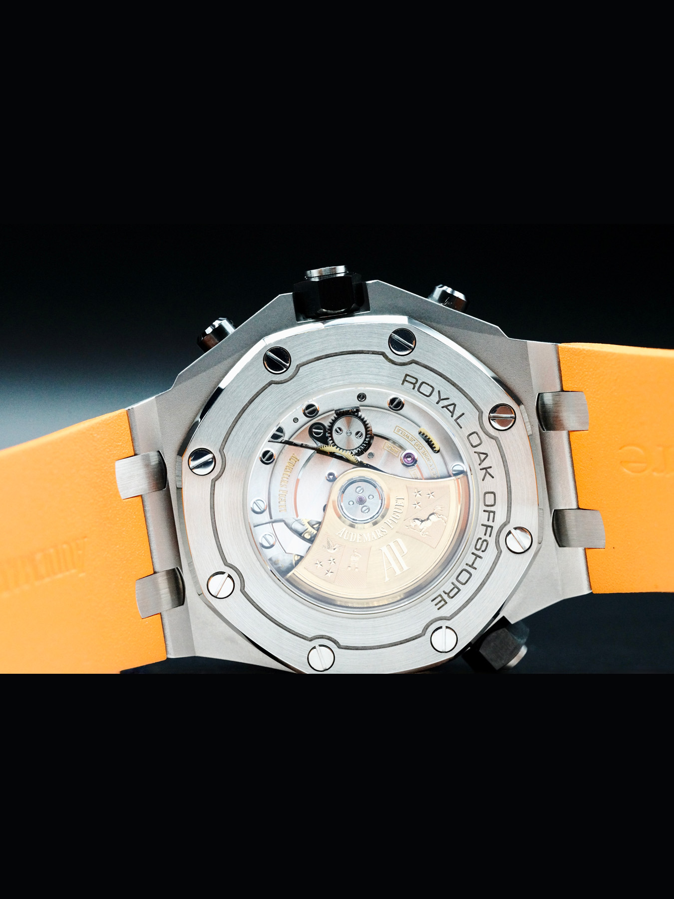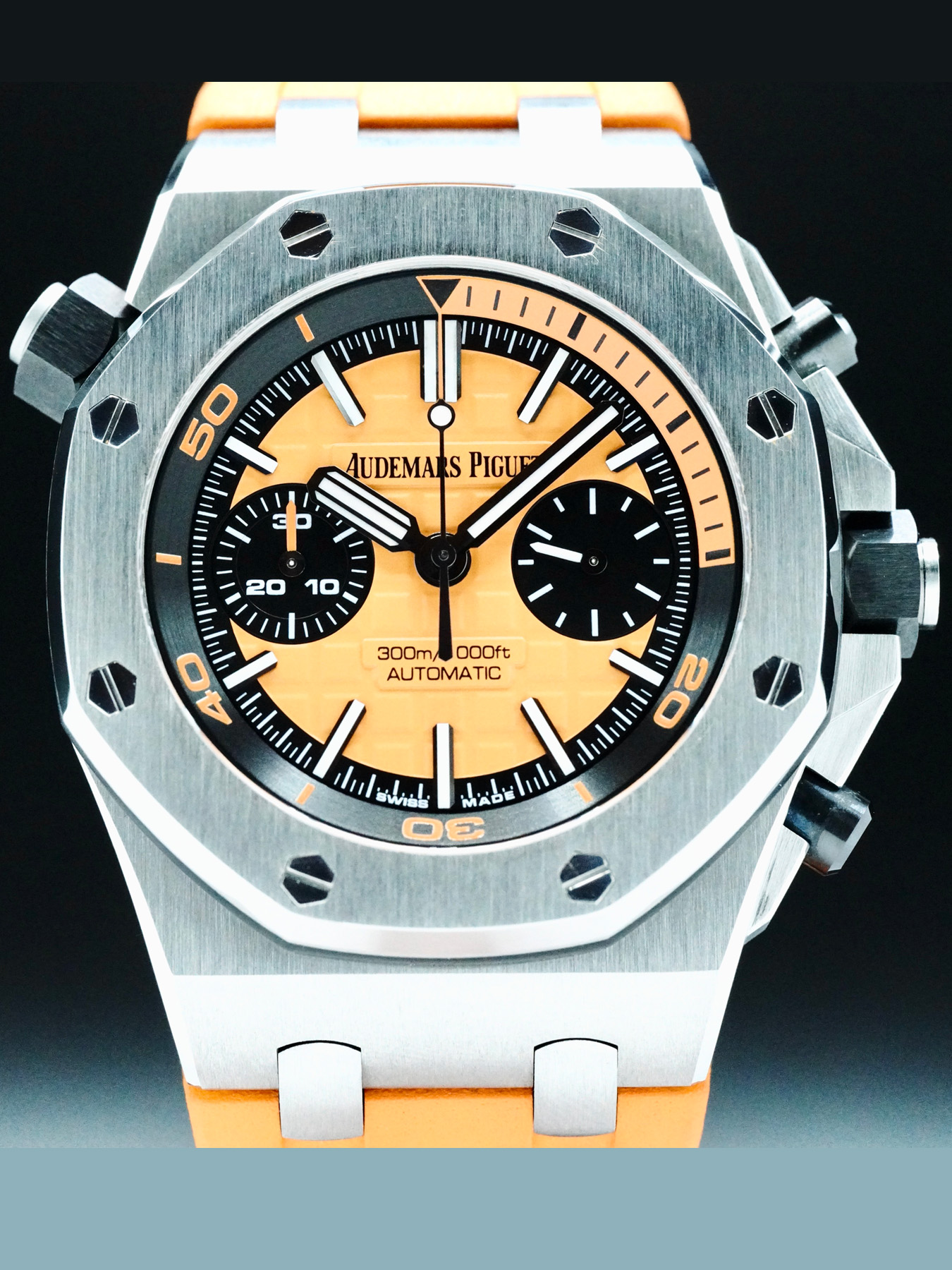 This Audemars Piguet Royal Oak Offshore Diver features a 42mm stainless steel case with an exhibition case back on an orange rubber strap. This watch also sports an orange dial with luminous hands and index dial markers covered by scratch resistant sapphire crystal.
