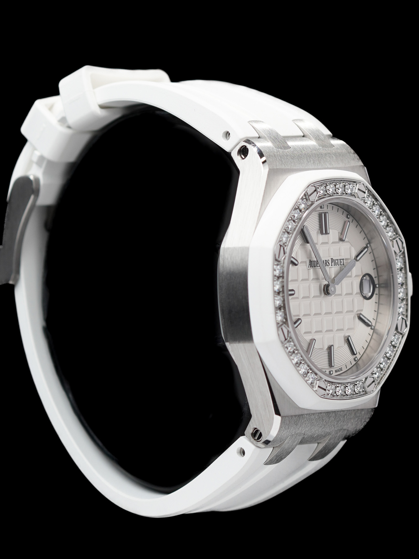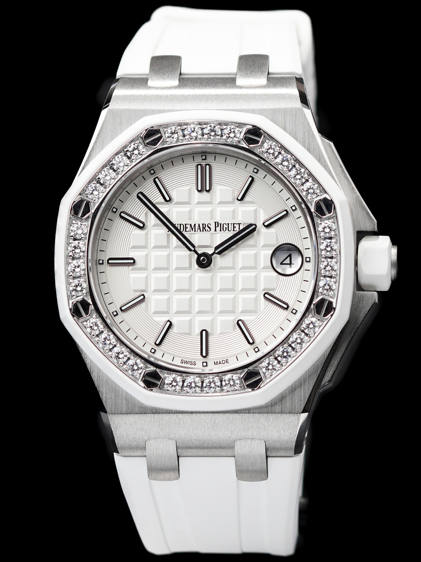 This watch features a 37mm X 48mm stainless steel case with diamonds bezel (+1ct) mounted on rubber strap. This watch also sports a silver dial. Powered by a quartz movement. Water resistance up to 50 meters.