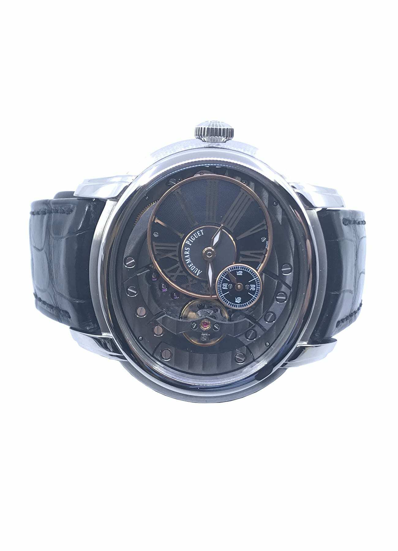 Black and anthracite dial, off-centred disc, black small seconds counter, pink gold applied Roman numerals and hands