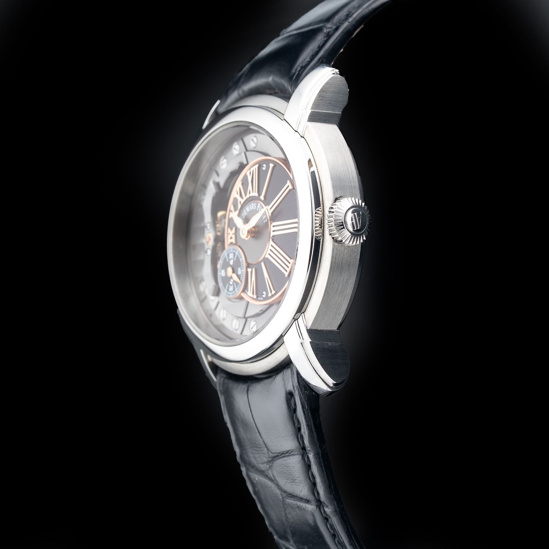 This watch features a 47mm white gold case on leather strap. This watch also sports a black dial. Powered by an automatic movement. Water resistance up to 20 meters.