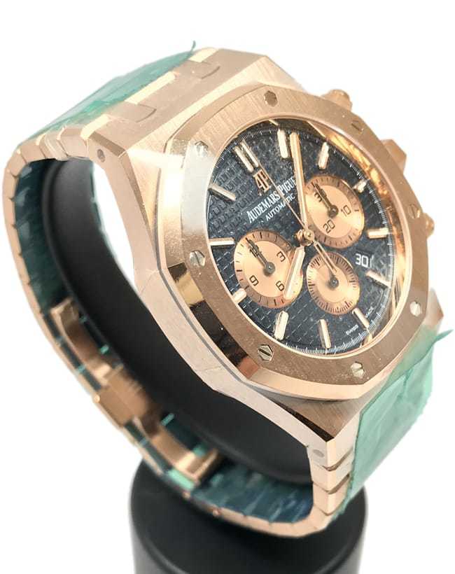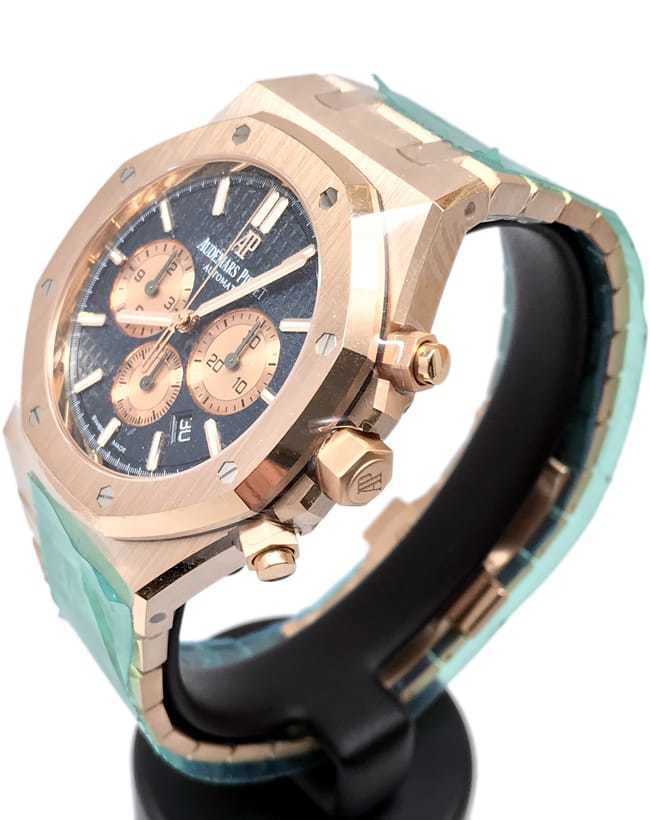 Blue dial with «Grande Tapisserie» pattern, pink gold-toned counters, pink gold applied hour-markers and Royal Oak hands with luminescent coating