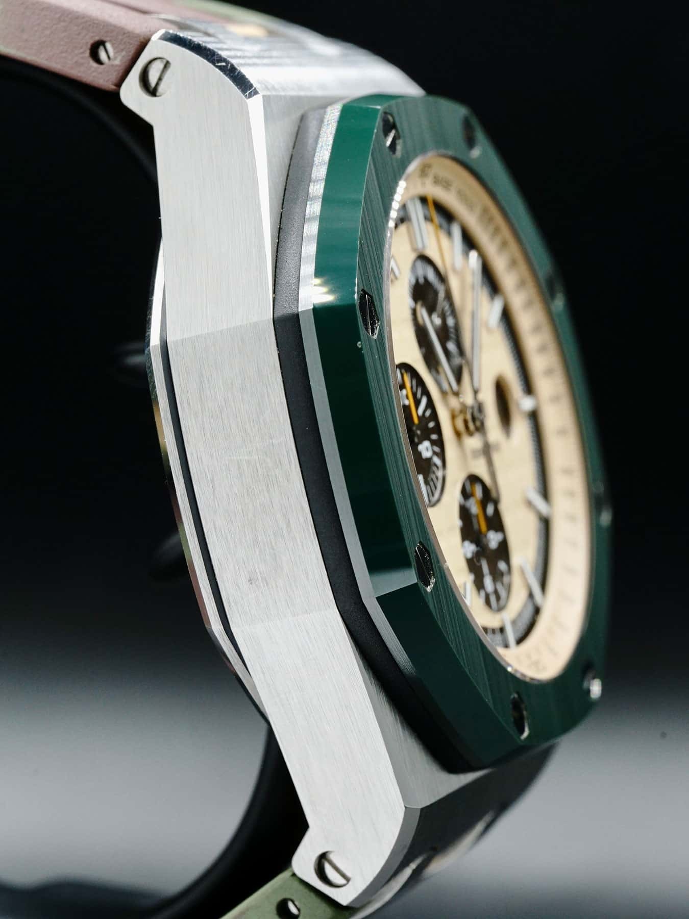 This Audemars Piguet Royal Oak Offshore 26400SO.OO.A054CA.01 features a 44mm Stainless Steel case with solid caseback, rubber strap. This watch also sports a beige dial with luminous hands and indexes.