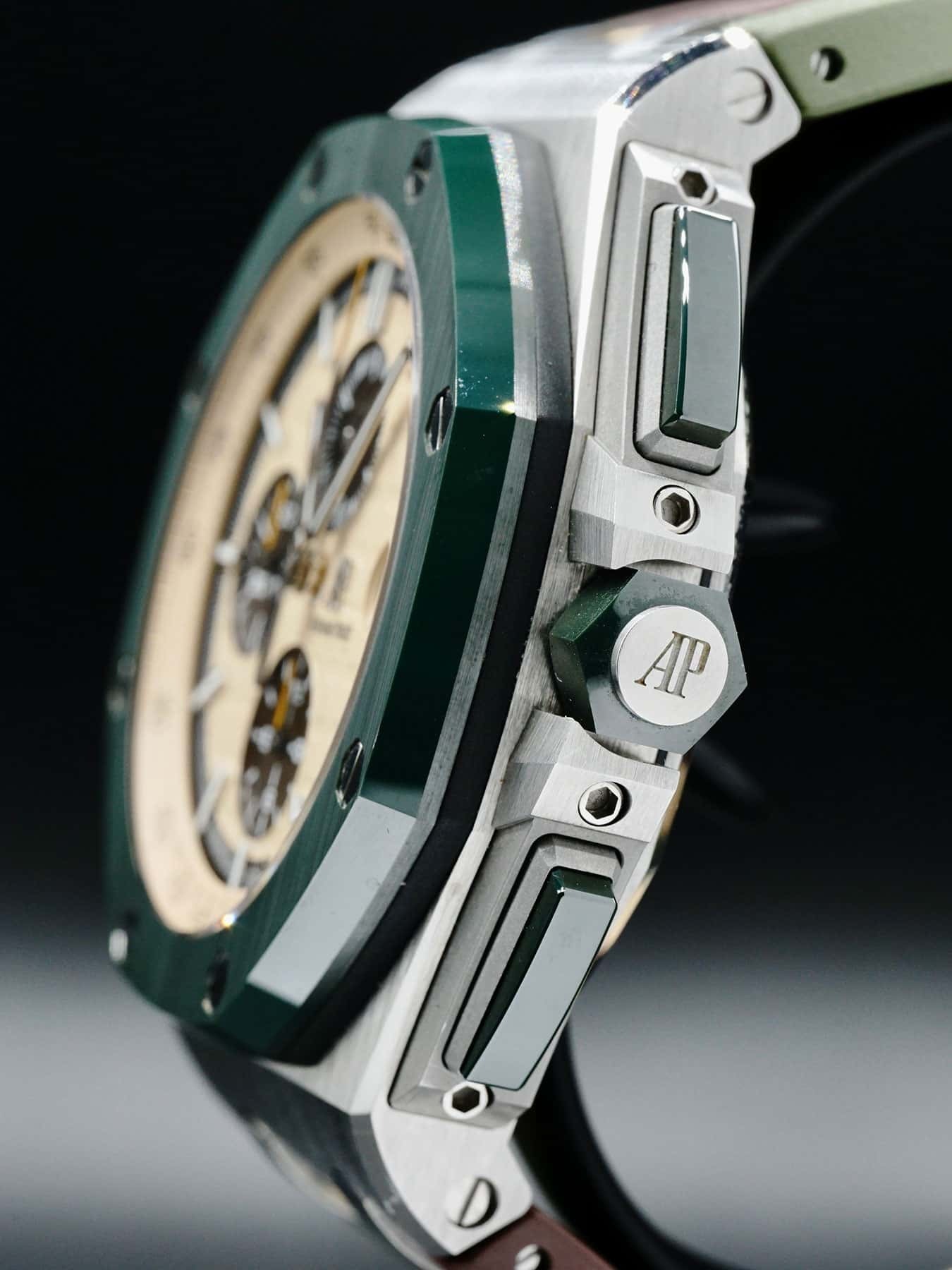 This Audemars Piguet Royal Oak Offshore 26400SO.OO.A054CA.01 is in EXCELLENT condition. it has boxes and papers. Extra green rubber strap.