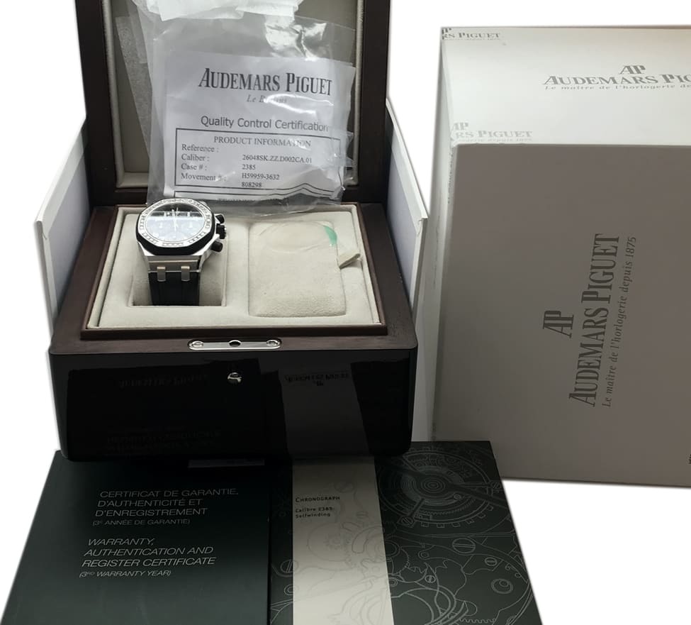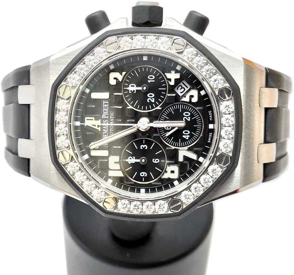 Excellent condition, it has all boxes, fully serviced at Audemars Piguet. Selfwinding chronograph with date display and small seconds at 6 oclock. Stainless steel case, black dial, black strap. 32 brilliant-cut diamonds, ~1.25 carats.