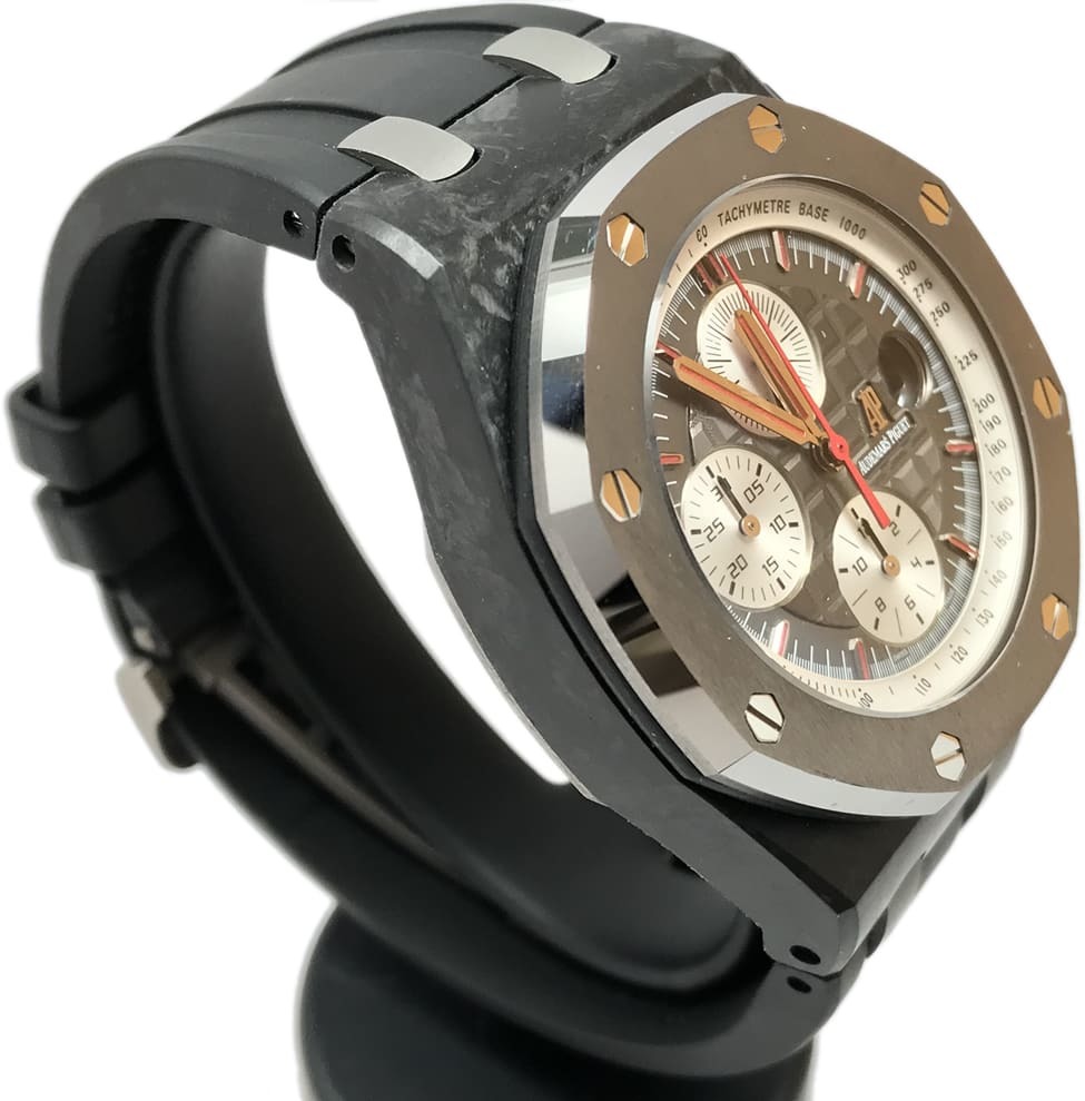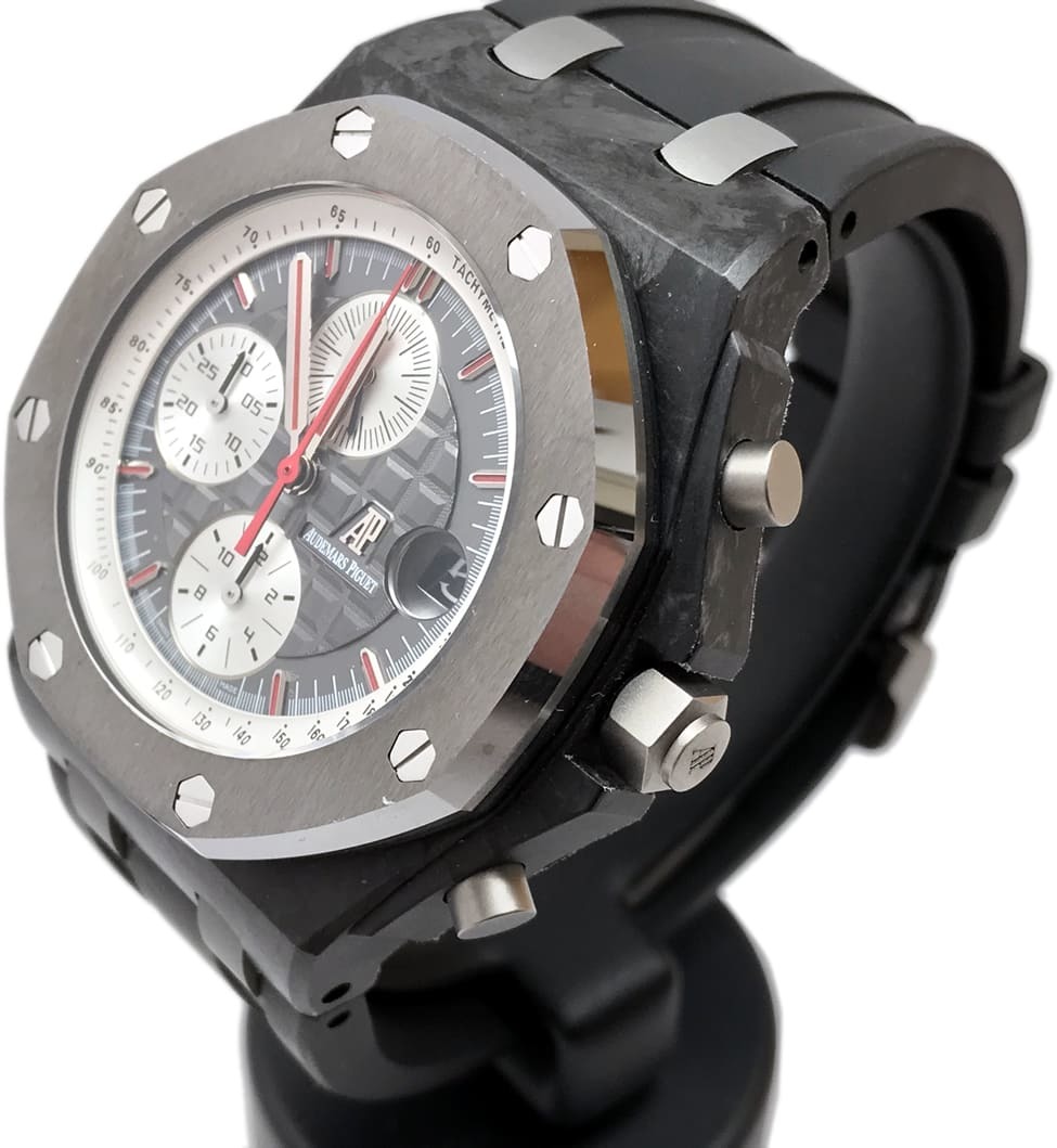 Brand new watch, it has boxes, papers and factory warranty. Selfwinding chronograph with date display and small seconds at 12 oclock. "Jarno" signature on the crystal and Méga Tapisserie pattern. Forged carbon case, anthracite dial, black strap. Limited edition. Forged carbon case, cermet bezel, sand-blasted titanium crown and pushpieces, glareproofed sapphire crystal, sandblasted titanium sapphire caseback engraved with the legend “Royal Oak Offshore – Jarno Trulli” and with the “Jarno” signature appearing in red on the crystal