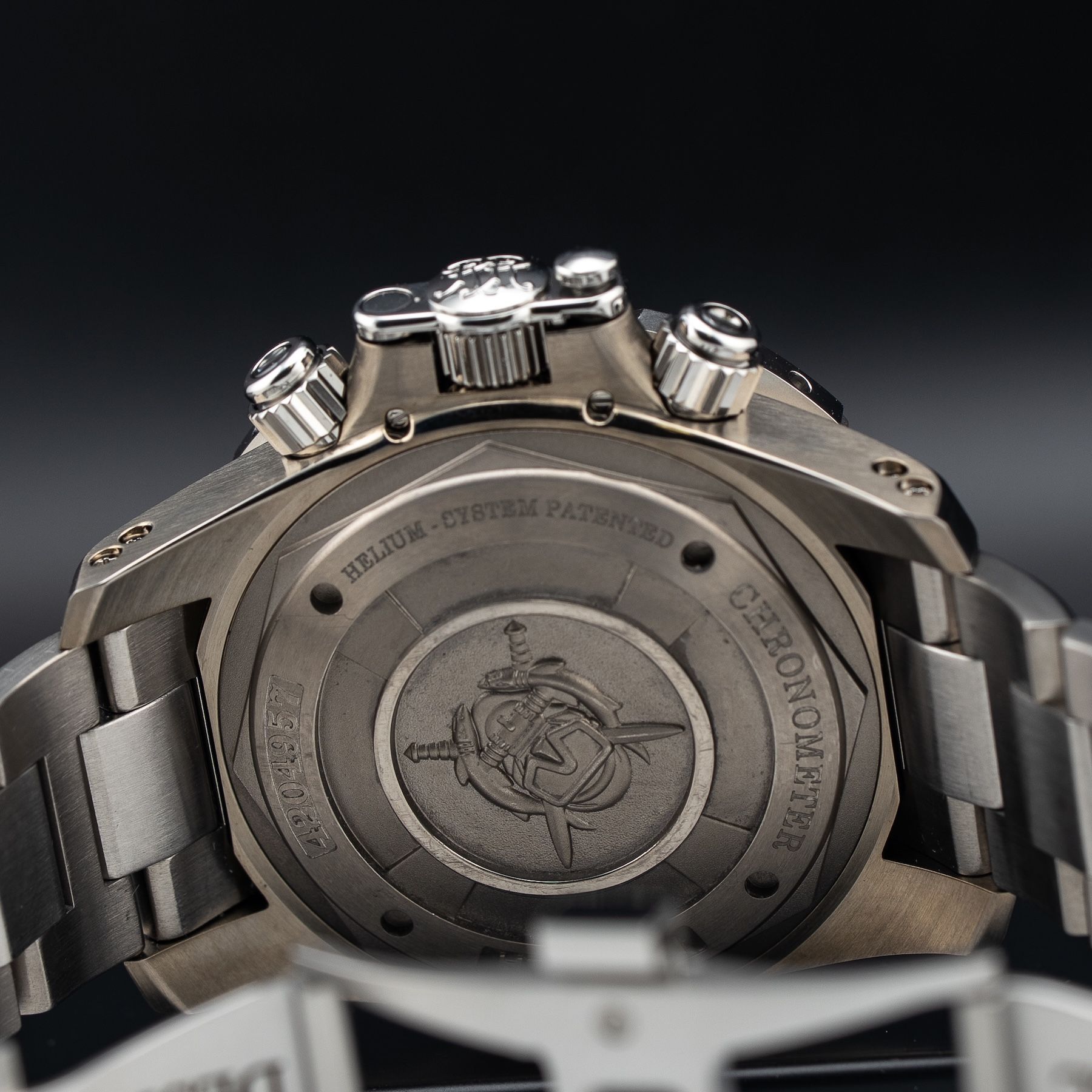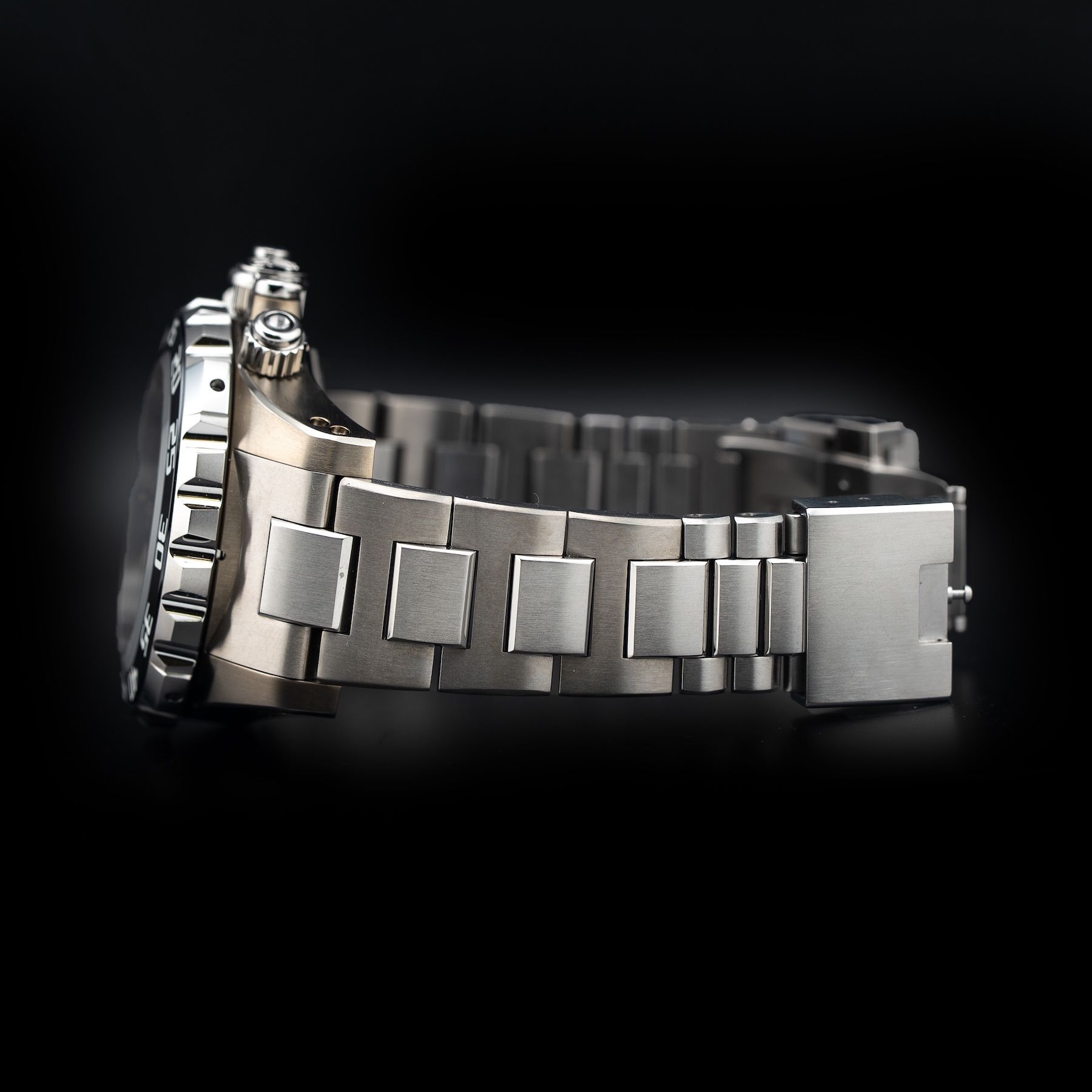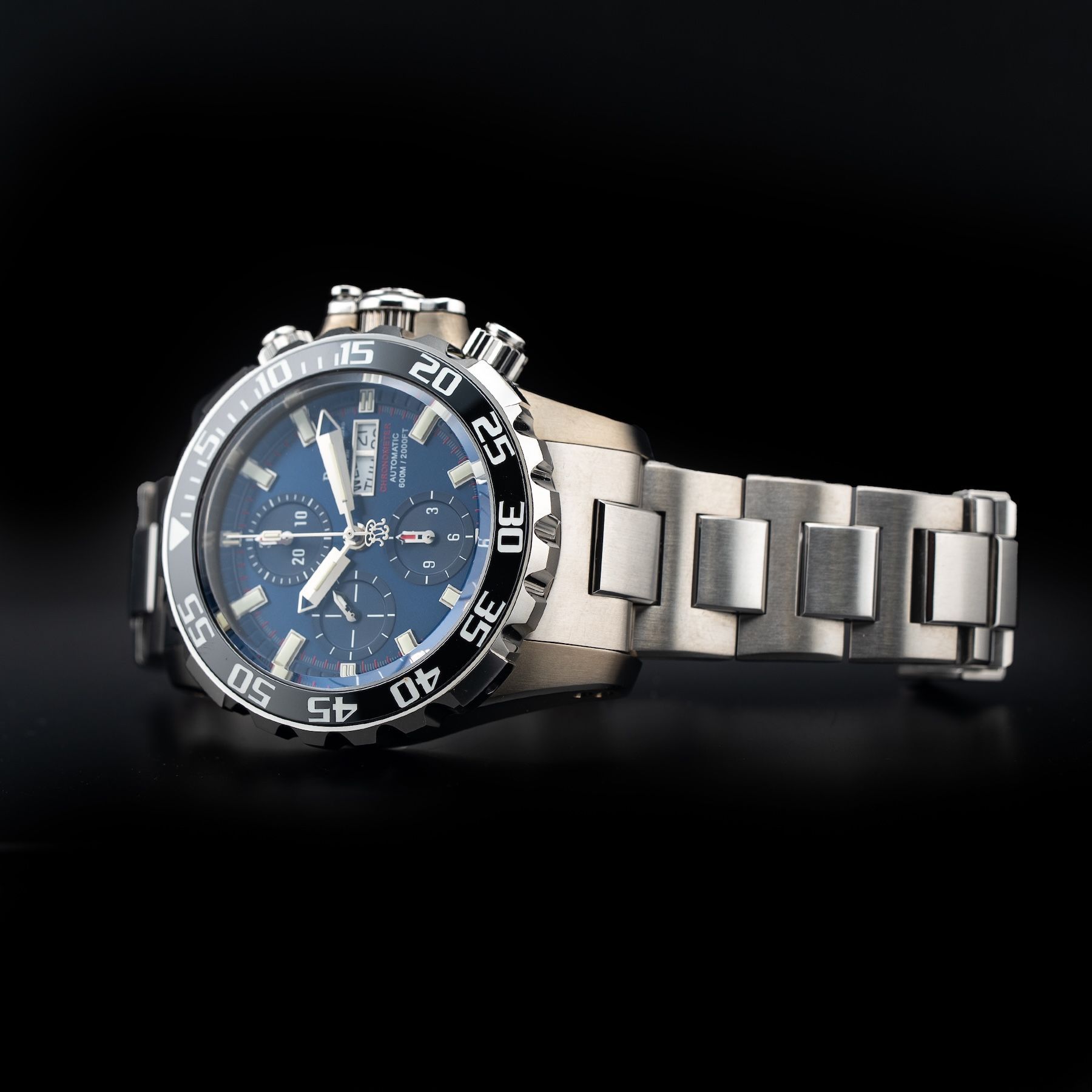 This watch features a 42mm titanium case on titanium & stainless steel bracelet. This watch also sports a blue dial. Powered by an automatic movement. Water resistance up to 600 meters.
