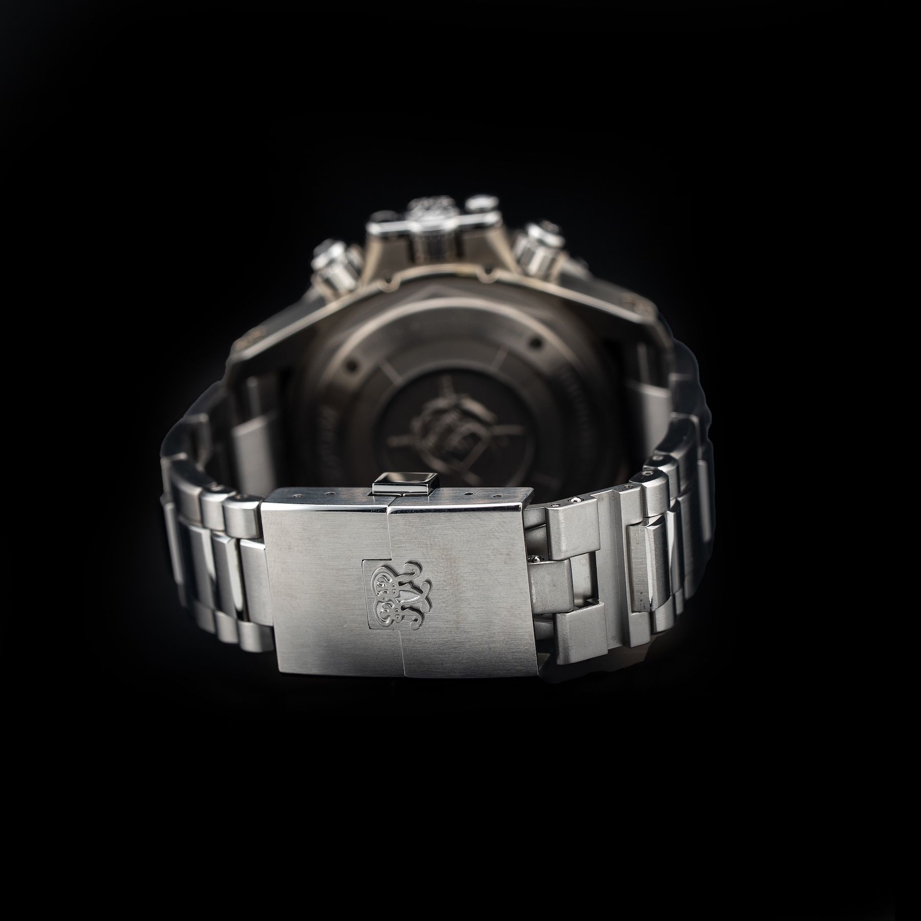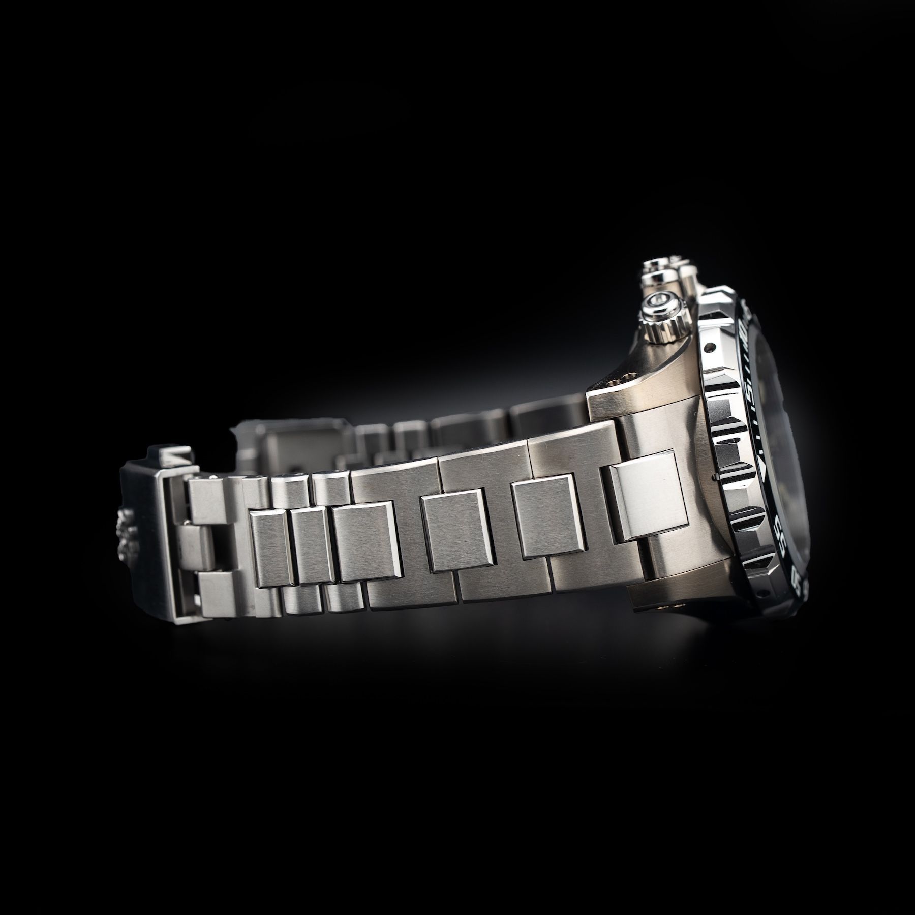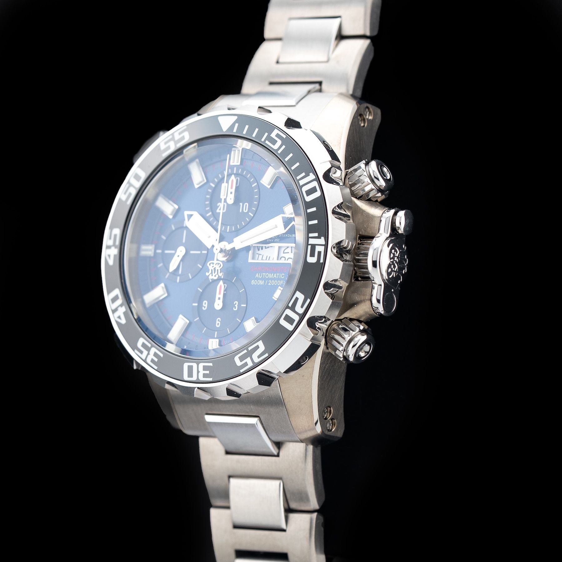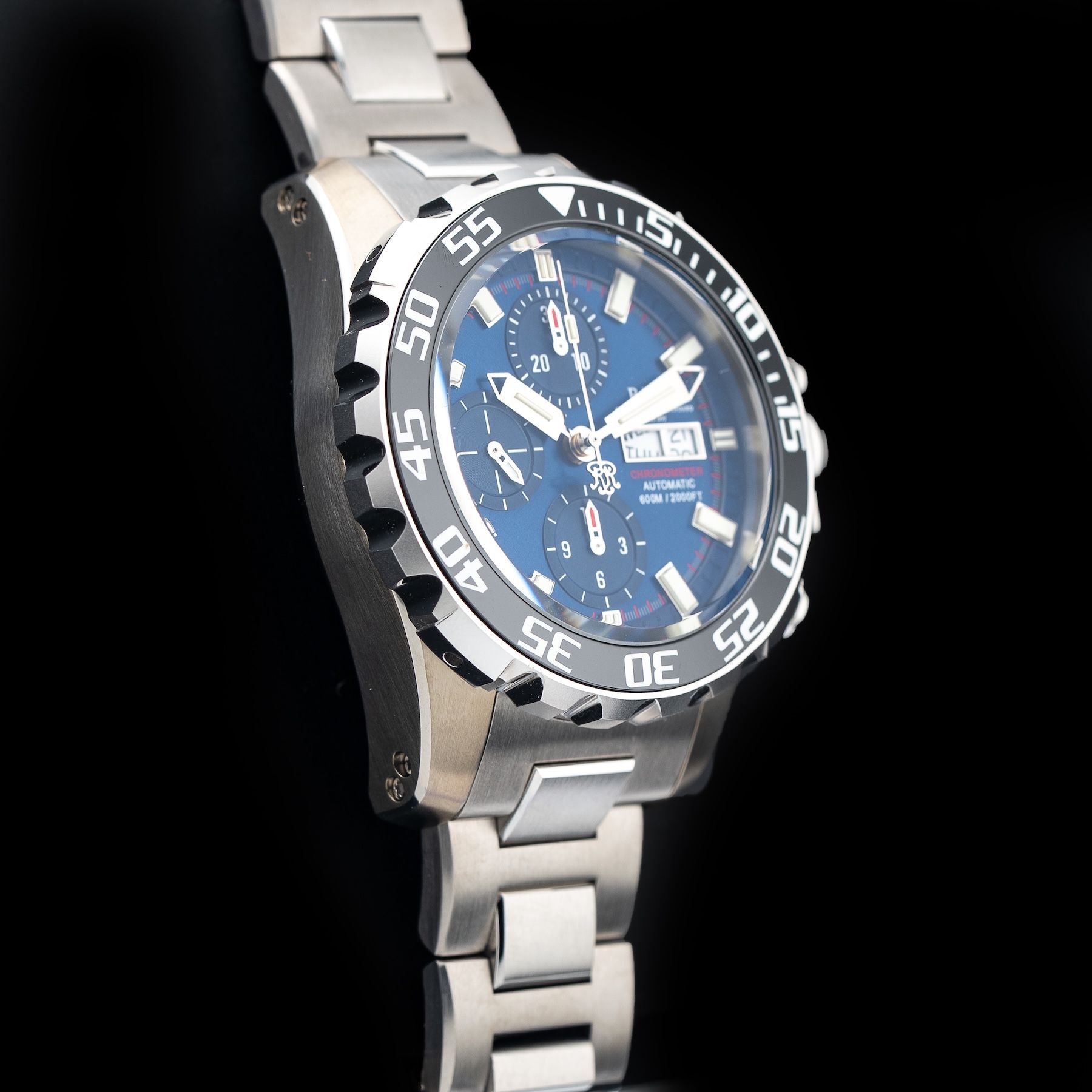 This watch features a 42mm titanium case on titanium & stainless steel bracelet. This watch also sports a blue dial. Powered by an automatic movement. Water resistance up to 600 meters.